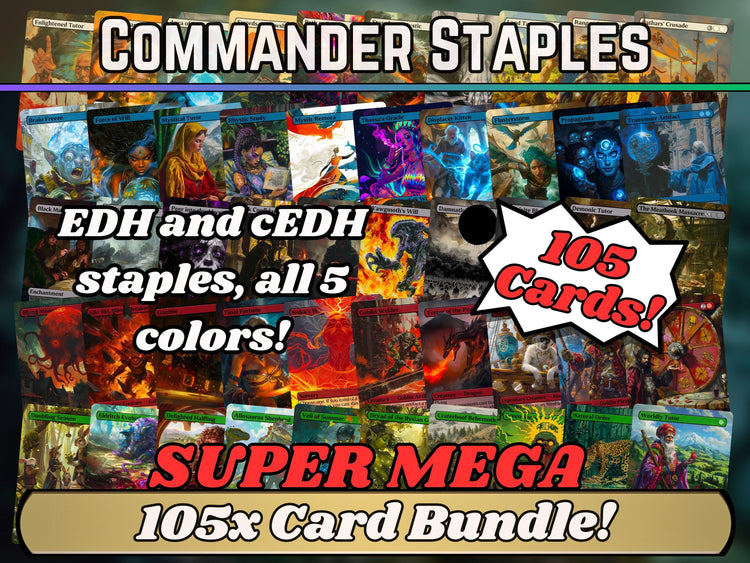 Build better decks with this ultimate Commander Staples Super Mega Bundle! Featuring 105 full-art cards across all five colors, this set is loaded with must-have pieces for EDH and cEDH alike. Perfect for customizing precons, enhancing casual builds, or gifting to MTG fans.