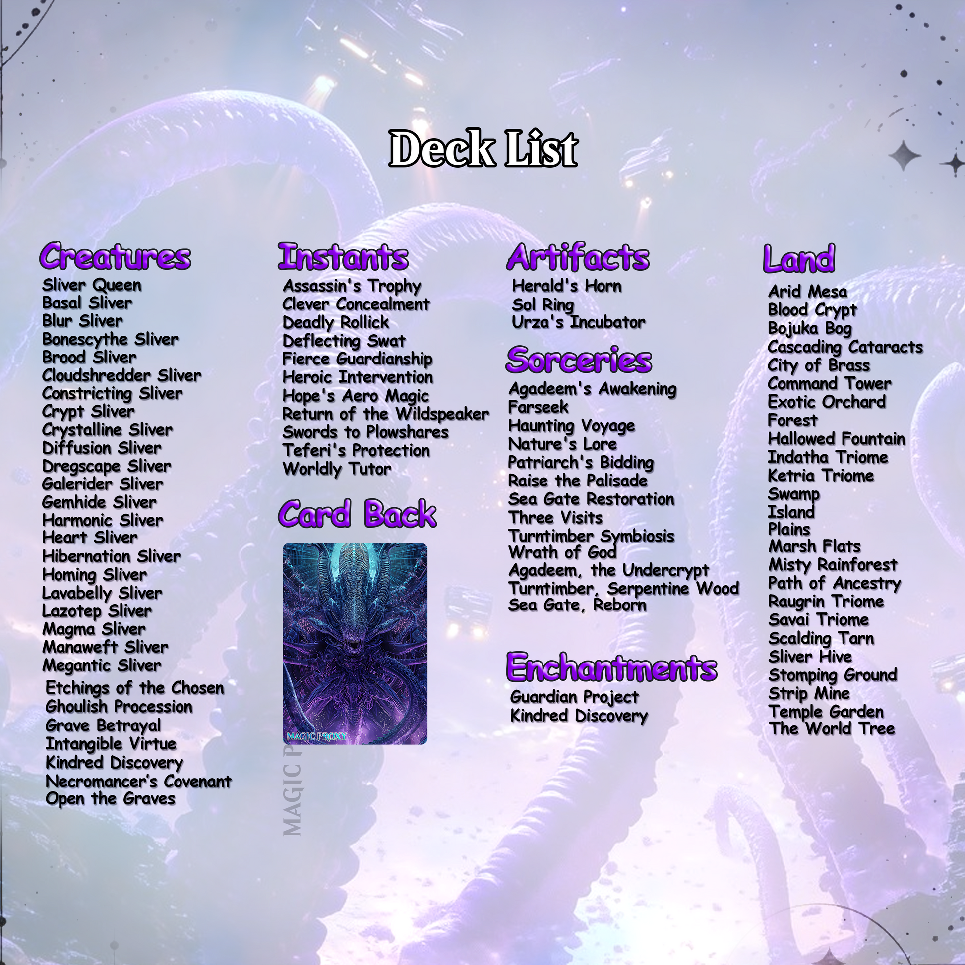 💀 Built for players who love synergy and strategy, this deck captures the horror and elegance of a xenomorphic empire. Every Sliver shares its strength with the others — one becomes many, and many become unstoppable. What begins as a single pulse soon becomes the symphony of the Hive.