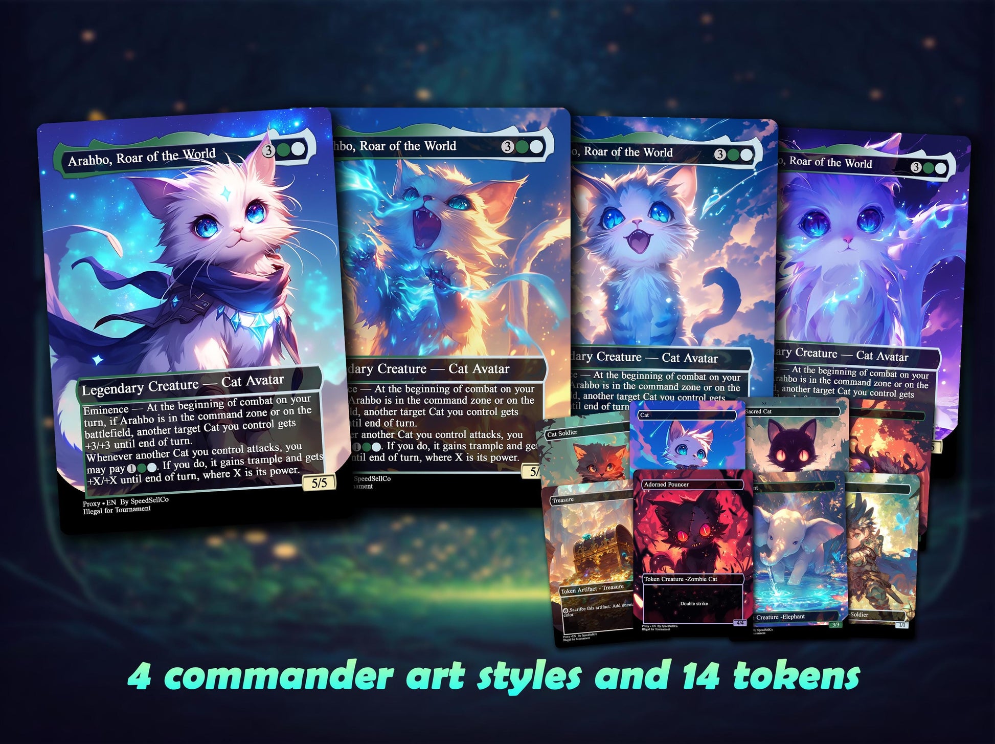 mtg proxy commander, commander proxy deck, edh deck proxies, mtg proxy, custom mtg cards, anime mtg proxies, chibi cat tokens, cat tribal mtg deck, commander anime deck, proxy mtg deck