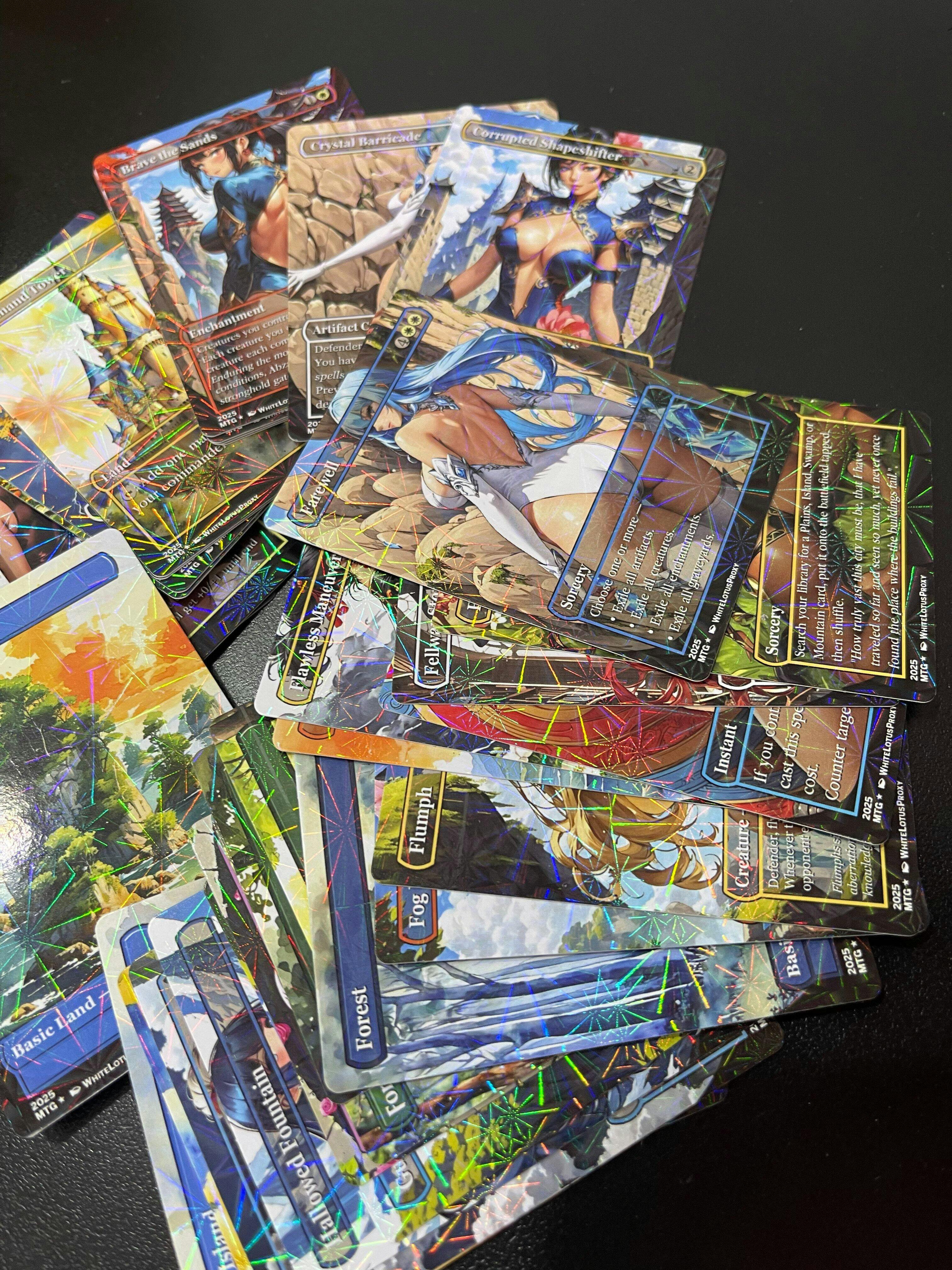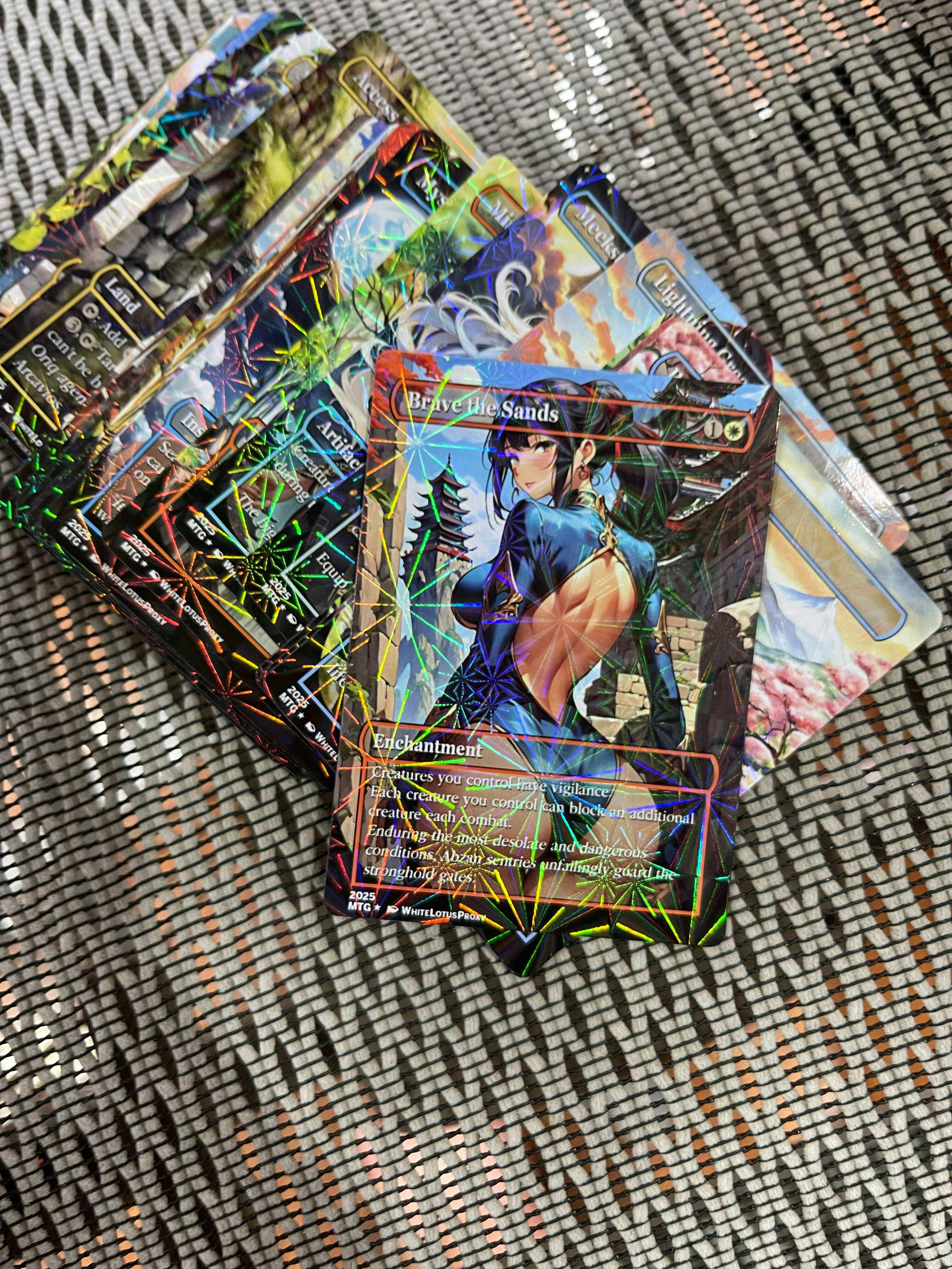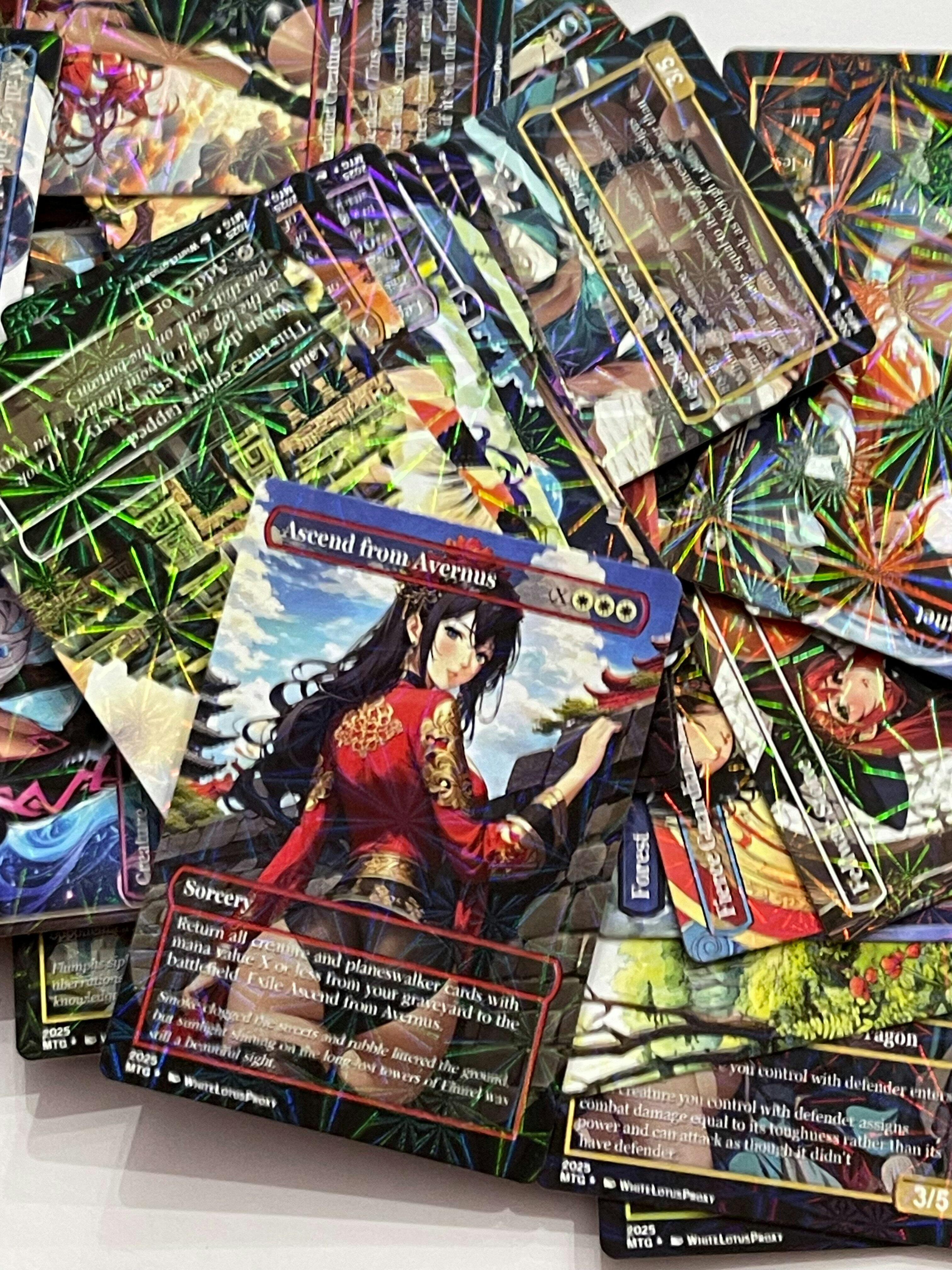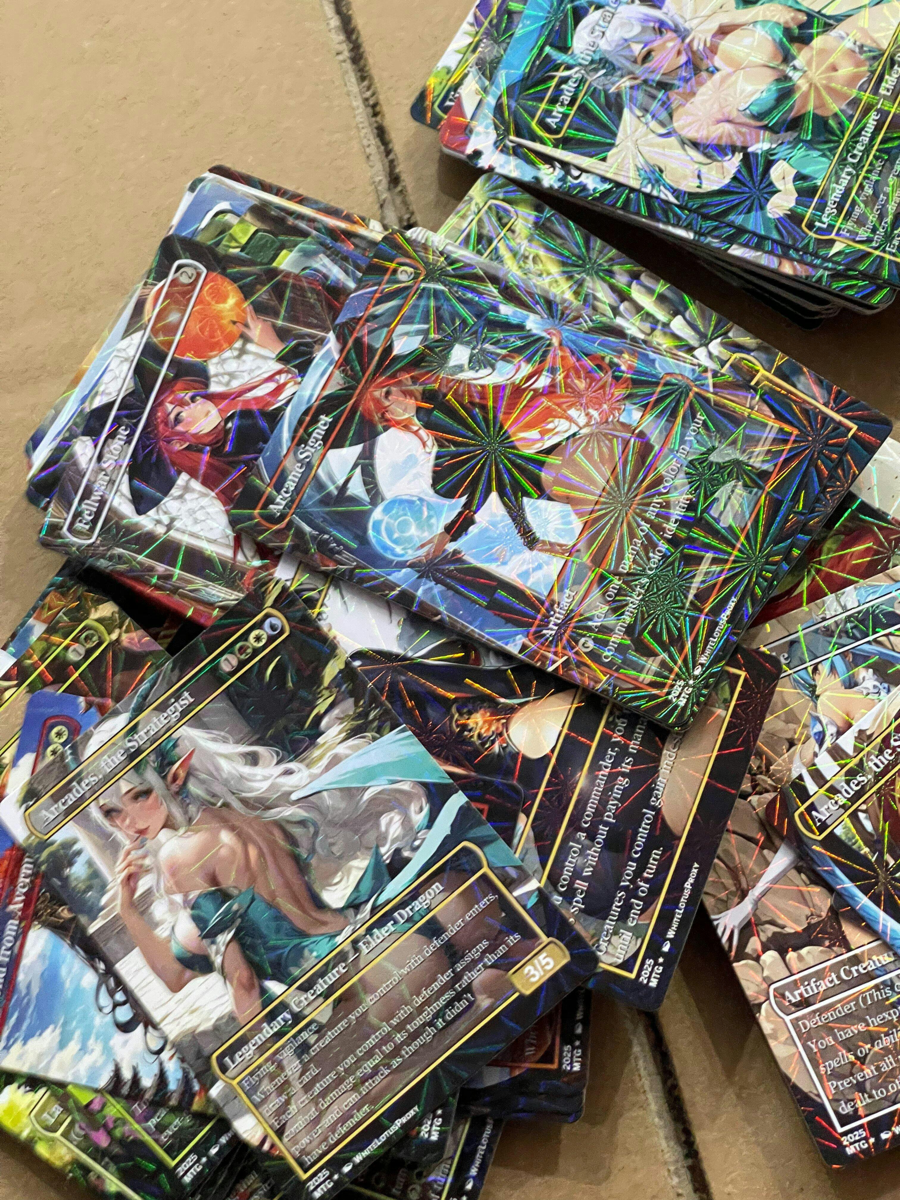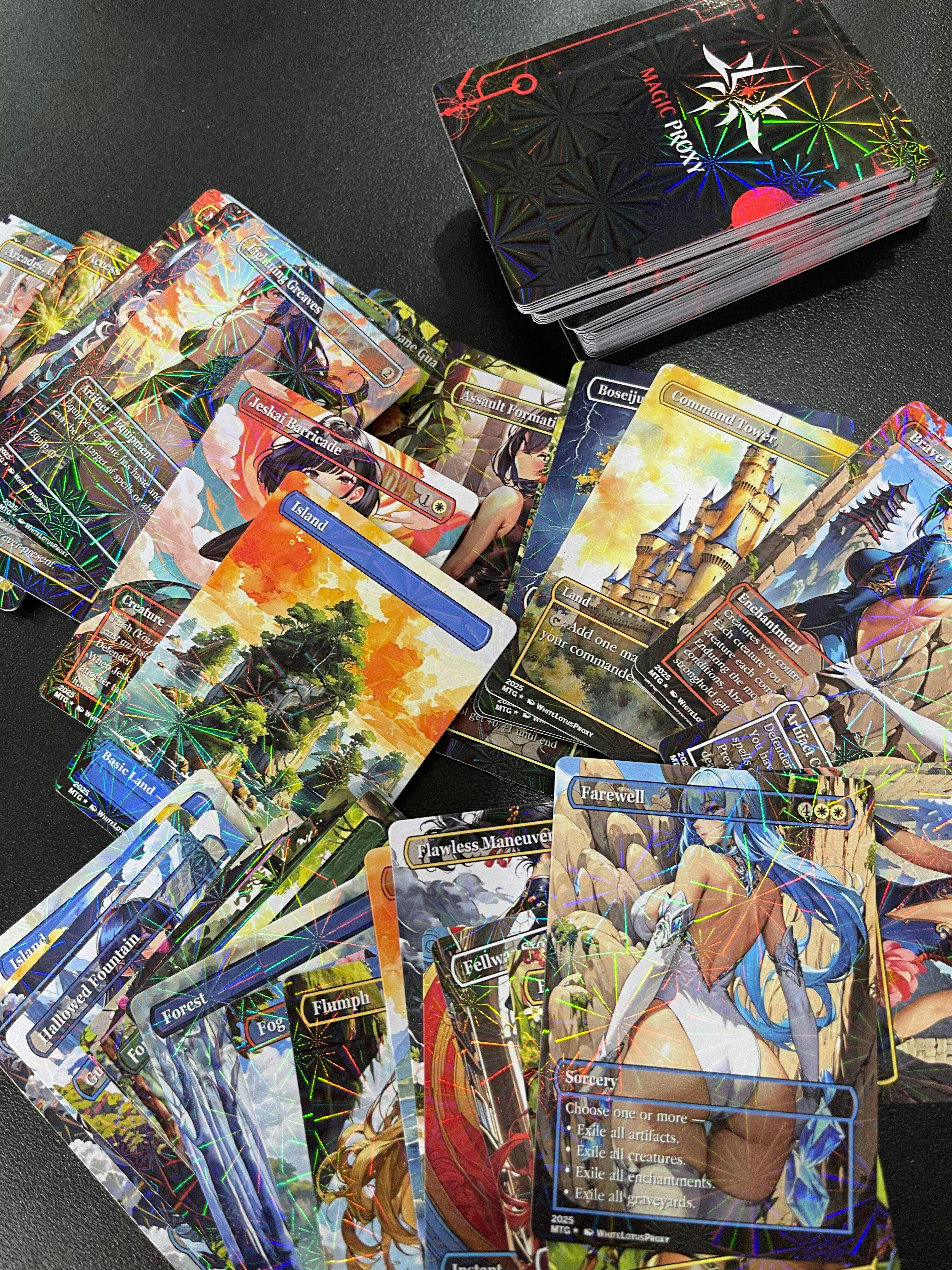 Our custom decks offer a truly unique experience, featuring fully frames, customized artwork, mana symbols, etc... designed to enhance the theme and style of each deck. Every card is meticulously crafted to provide a one-of-a-kind aesthetic while maintaining the quality you expect for seamless gameplay.