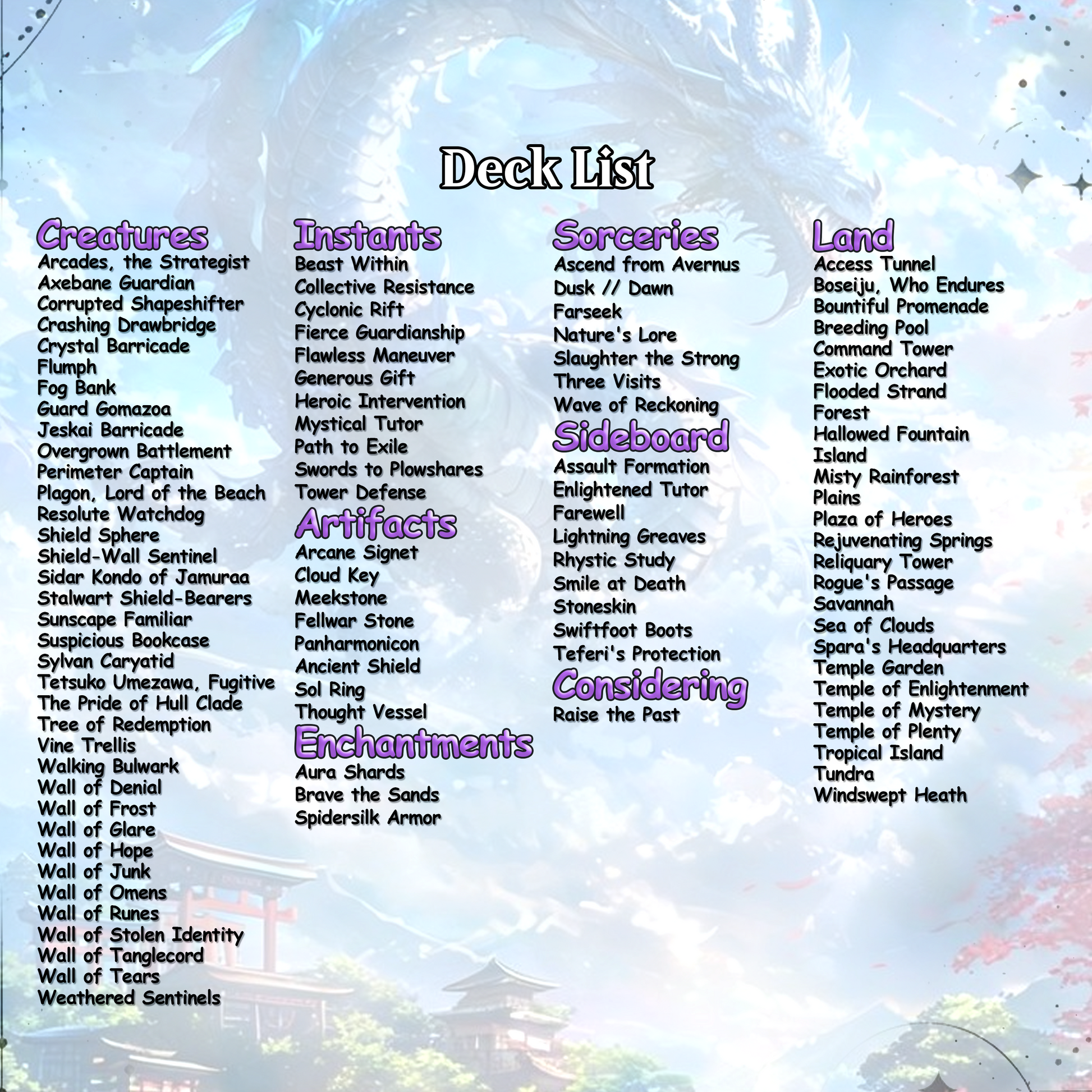 What starts as a control deck quickly pivots into a burst damage machine, with walls swinging for massive chunks of life total thanks to Arcades’ static ability. Your opponents won’t see it coming.