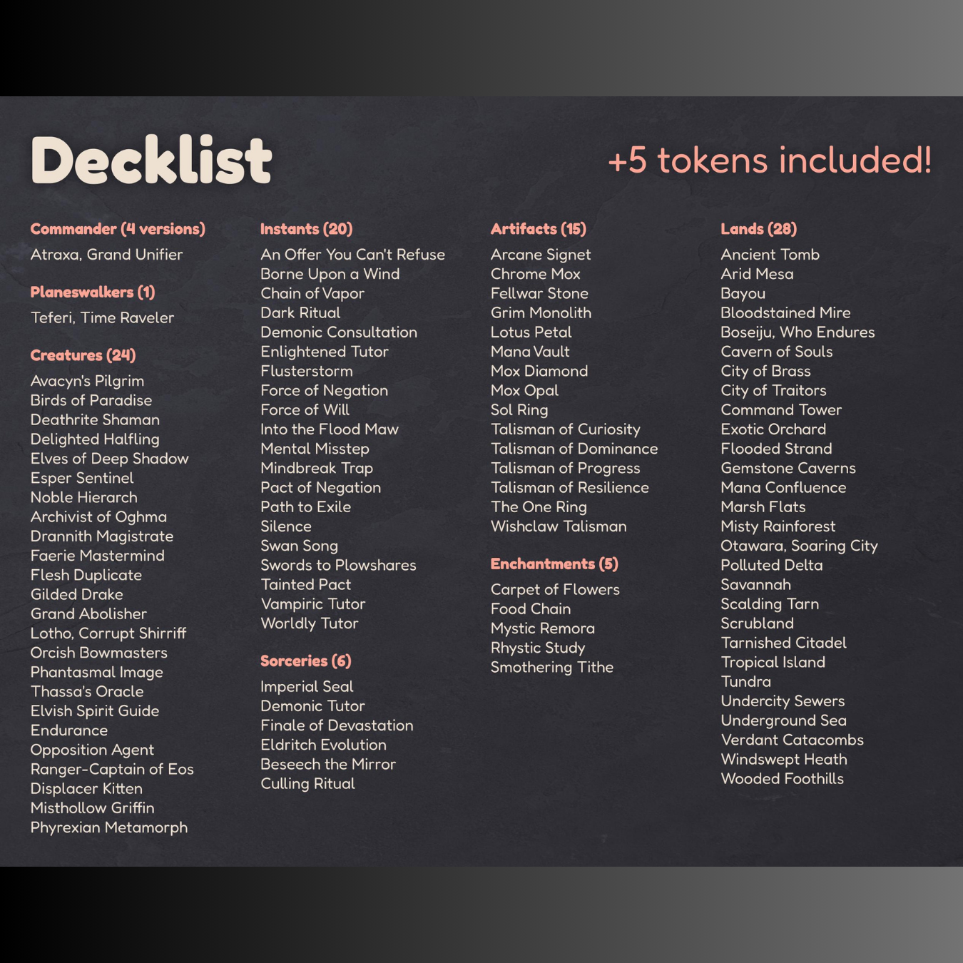 Atraxa shines as a late-game powerhouse. This midrange build ramps early, controls the board, then pivots into game-ending recursion and value. Once Atraxa hits the battlefield, your hand fills, your options multiply, and your advantage grows exponentially.