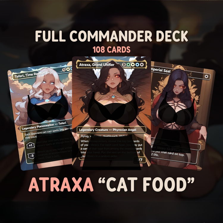The Atraxa Cat Food Commander Deck – Anime Proxy Edition is a 108-card EDH build focused on midrange value, recursion, and infinite combo potential. Designed with full-art anime waifu illustrations, this deck delivers late-game dominance with strategic control and burst finishers.