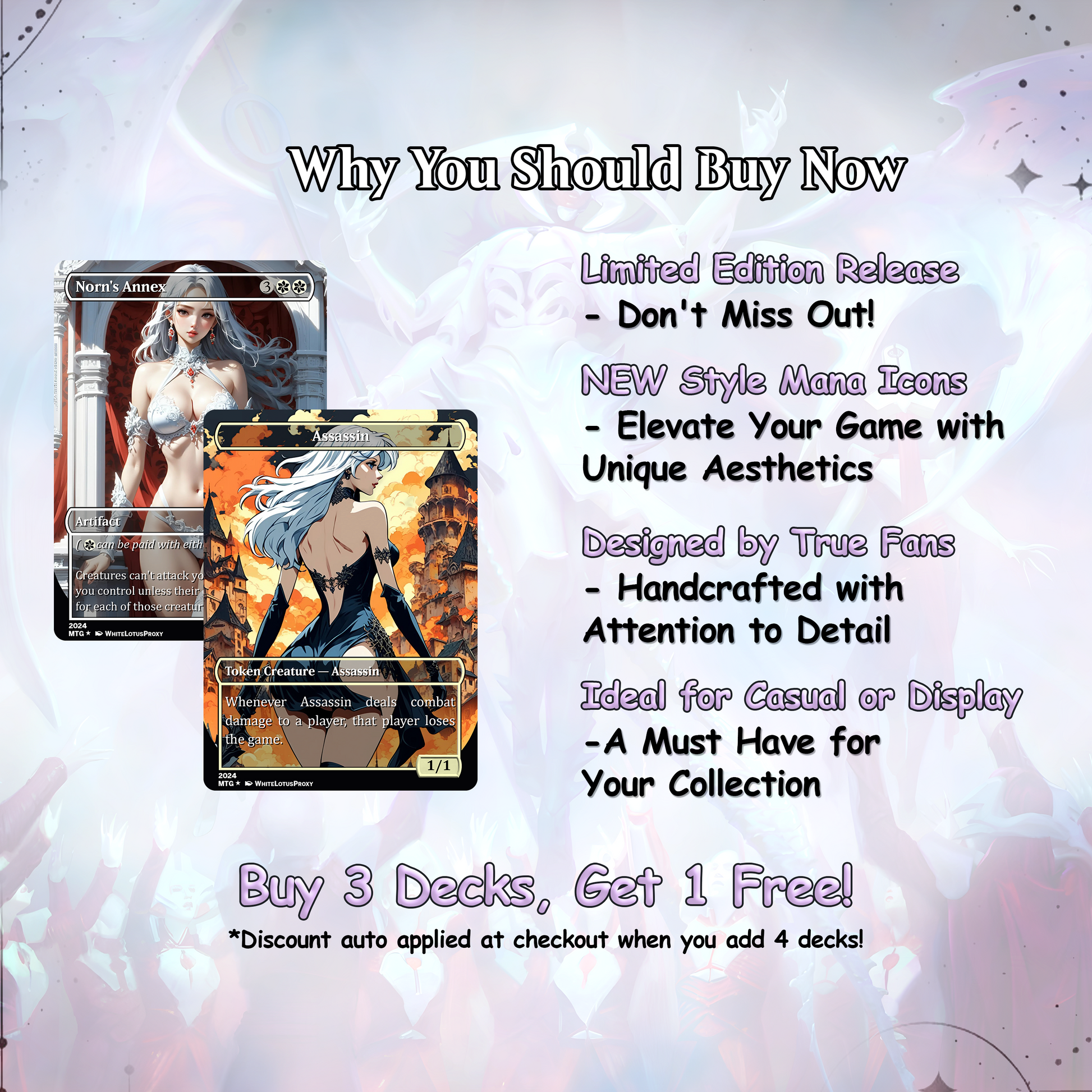 Our custom decks offer a truly unique experience, featuring fully frames, customized artwork, mana symbols, etc... designed to enhance the theme and style of each deck. Every card is meticulously crafted to provide a one-of-a-kind aesthetic while maintaining the quality you expect for seamless gameplay.