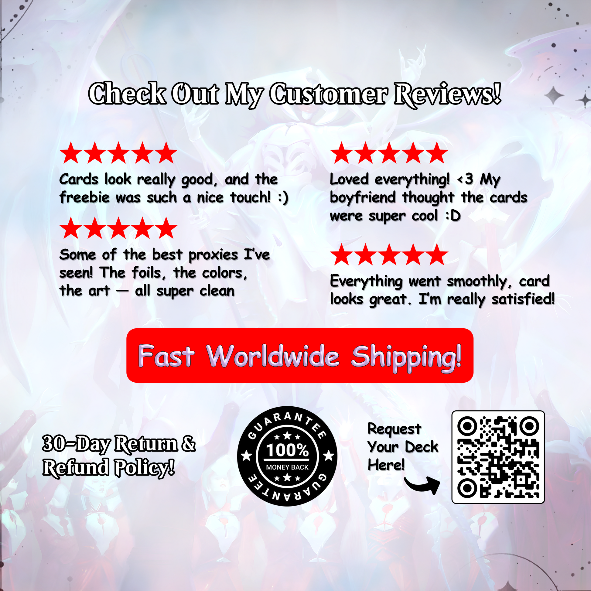 We encourage you to explore the photos and videos on our medias. If you have any questions or need further information, feel free to reach out to us at support@magicproxy.store —we’re here to help ensure you have the perfect deck for your collection or playstyle.