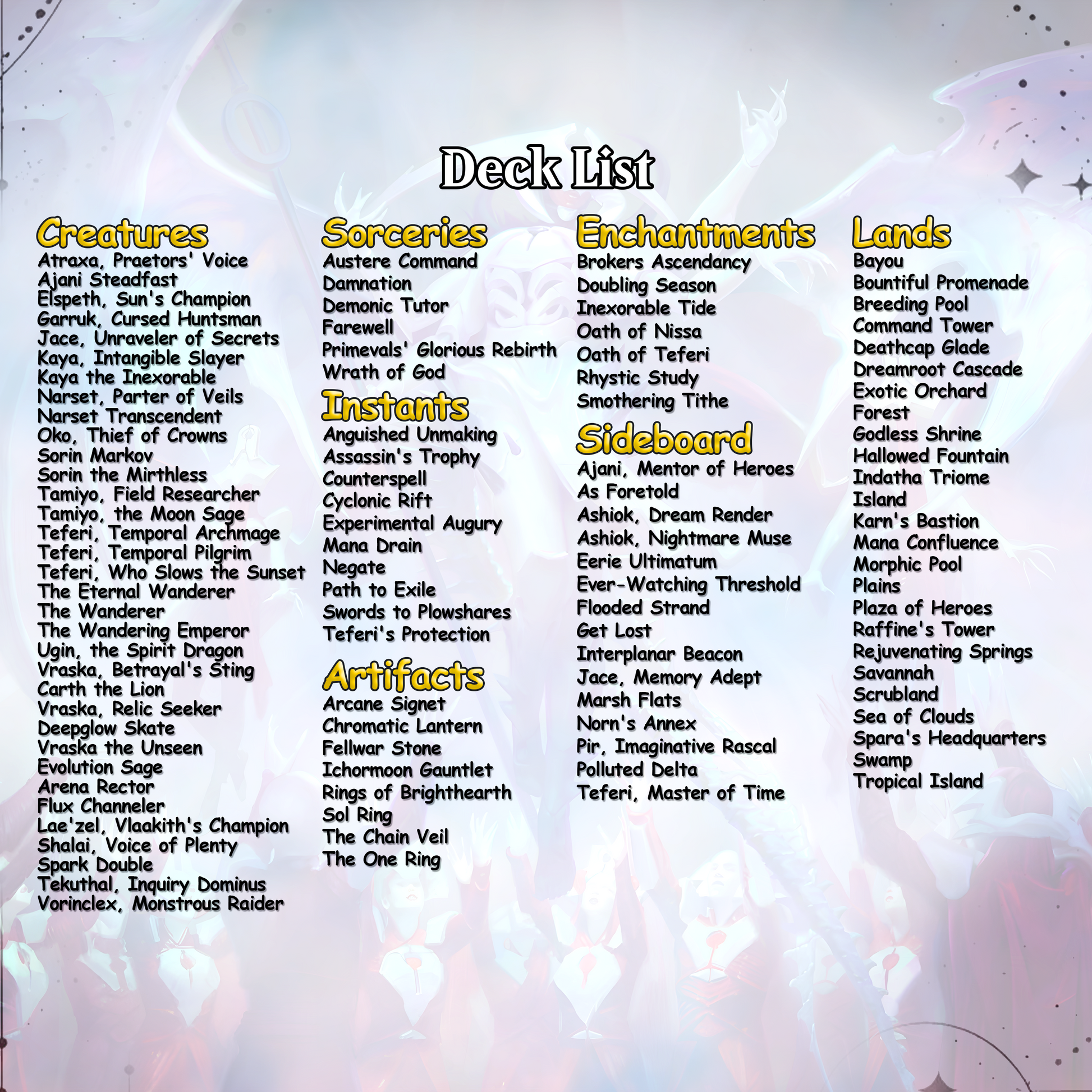 This is a custom fan-made proxy deck, not affiliated with any official TCG publisher. Intended for casual EDH play, testing, or artful display. Check with your local game store or organizer regarding proxy use.