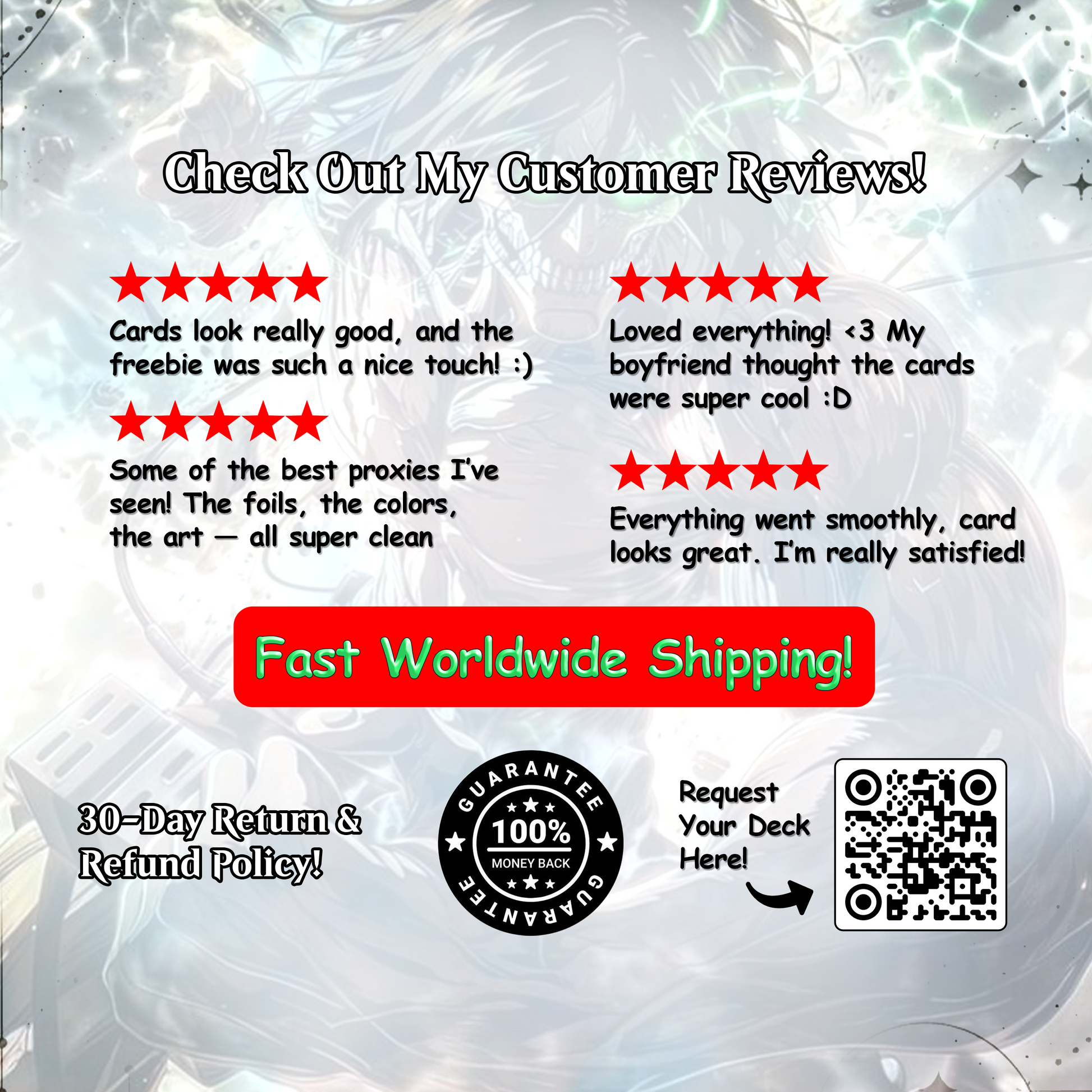 We encourage you to explore the photos and videos on our medias. If you have any questions or need further information, feel free to reach out to us at support@magicproxy.store —we’re here to help ensure you have the perfect deck for your collection or playstyle.