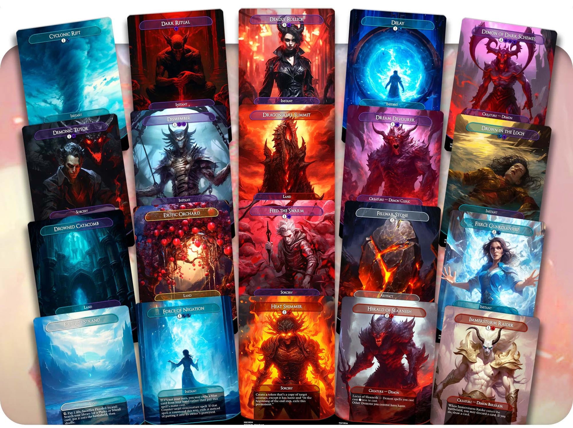 Our custom decks offer a truly unique experience, featuring fully frames, customized artwork, mana symbols, etc... designed to enhance the theme and style of each deck. Every card is meticulously crafted to provide a one-of-a-kind aesthetic while maintaining the quality you expect for seamless gameplay.