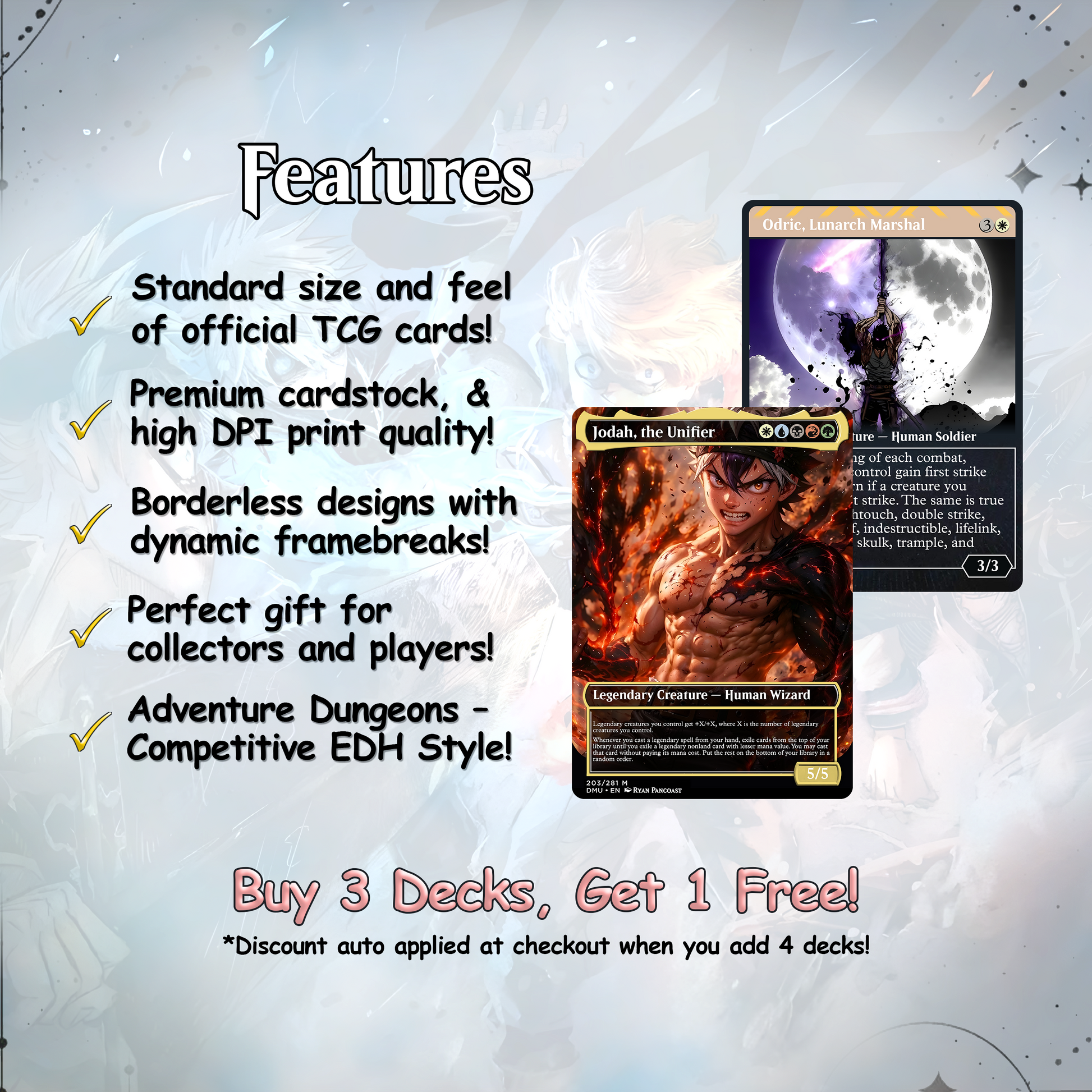 Join the Black Bulls and harness the chaotic brilliance of legendary magic. Led by Jodah, the Unifier, this five-color Commander deck channels the raw power of heroes, kings, and outcasts alike — weaving them into one spellbinding tapestry of strength and unity.
