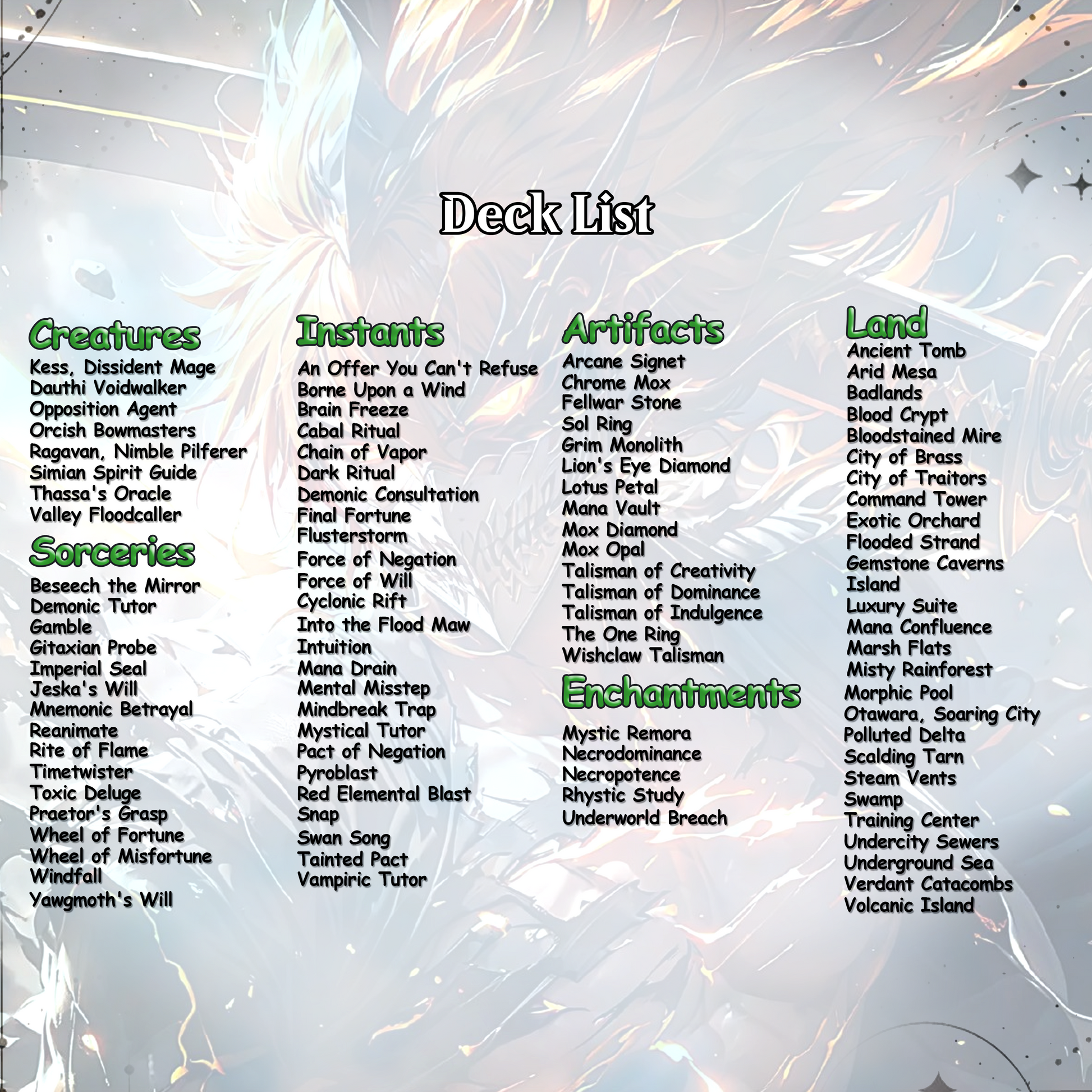 💫 Built for competitive EDH players and fans of anime-style spellcraft, this custom proxy deck blends storm combo precision, graveyard recursion, and control mastery. With Ad Nauseam, Underworld Breach, and Thassa’s Oracle, victory isn’t just inevitable — it’s sculpted from the remnants of your own destruction. Every turn is a spiritual duel. Every cast, a forbidden ritual.