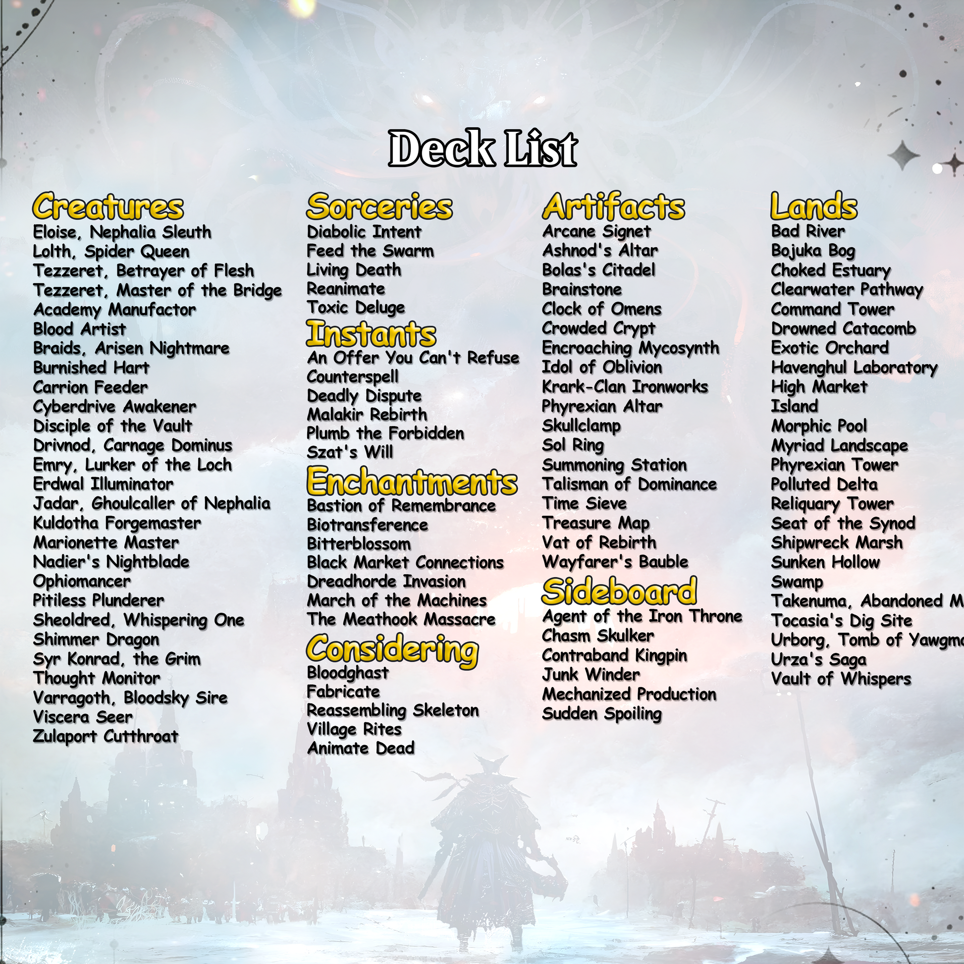 ⚙️ Built for players who thrive on dark synergy and methodical combo play, this deck weaves artifact engines, death triggers, and surveil recursion into one seamless ritual of power. With Tezzeret, Master of the Bridge, Braids, Arisen Nightmare, and Marionette Master orchestrating the symphony, your board becomes a gothic machine — elegant, efficient, and merciless.