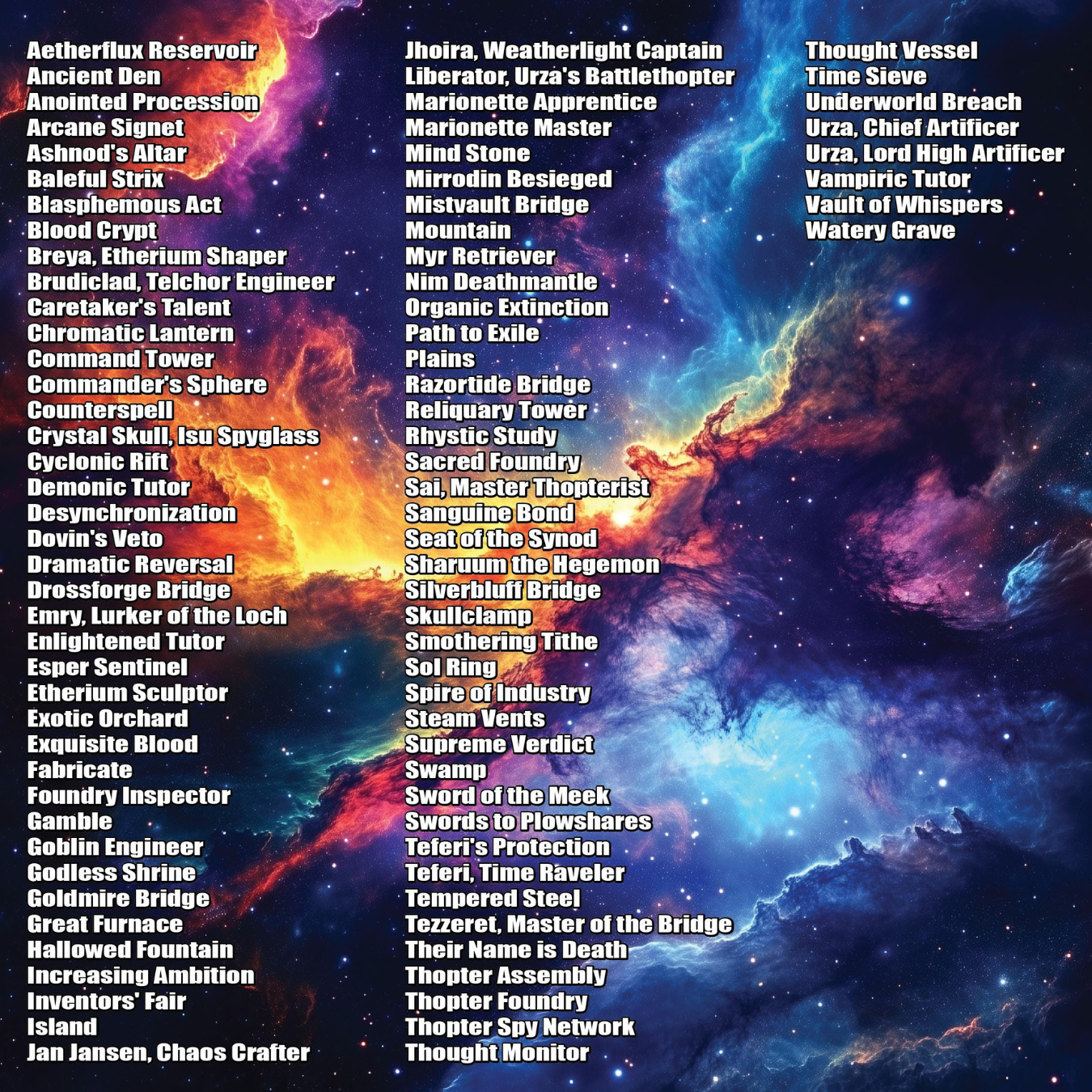 Breya commands a refined combo strategy. Generate infinite mana with powerful artifact loops, clear the board with pinpoint control, and finish with dominating plays. Whether you're assembling a win-con or grinding out value, this deck rewards strategic play with explosive turns.