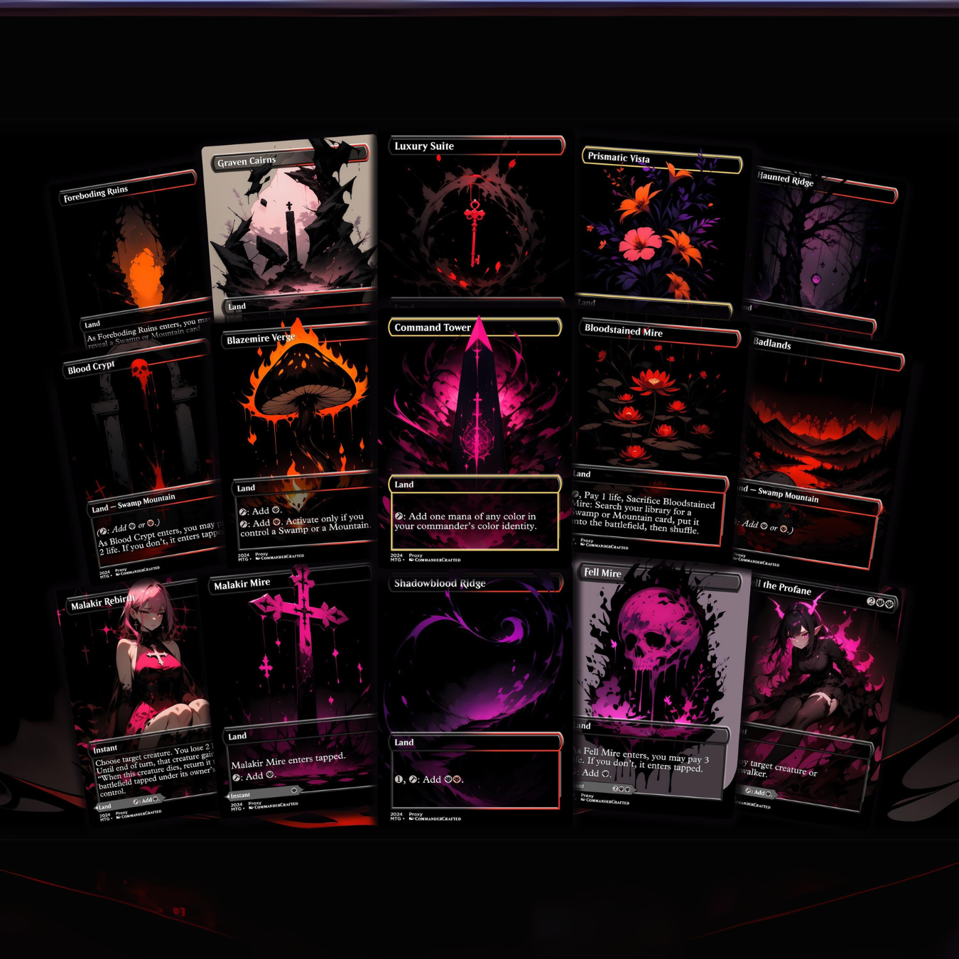 Our custom decks offer a truly unique experience, featuring fully frames, customized artwork, mana symbols, etc... designed to enhance the theme and style of each deck. Every card is meticulously crafted to provide a one-of-a-kind aesthetic while maintaining the quality you expect for seamless gameplay.