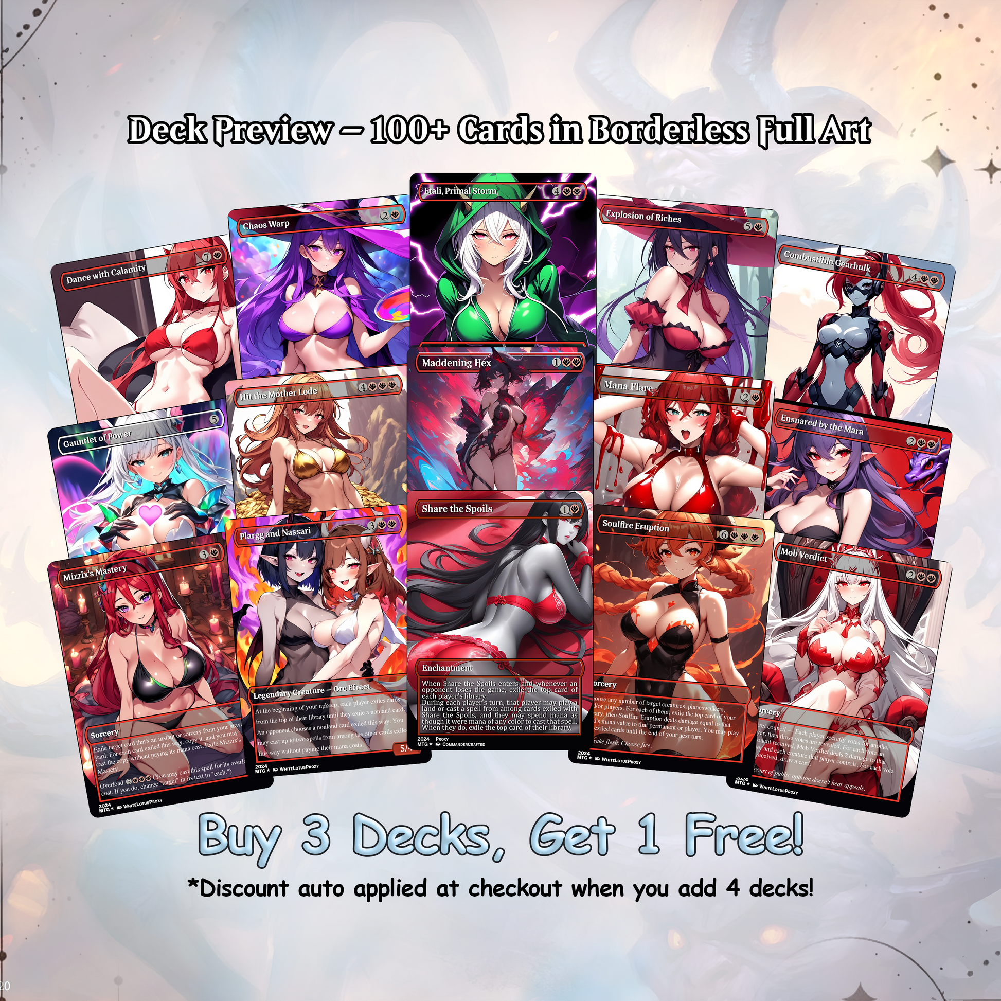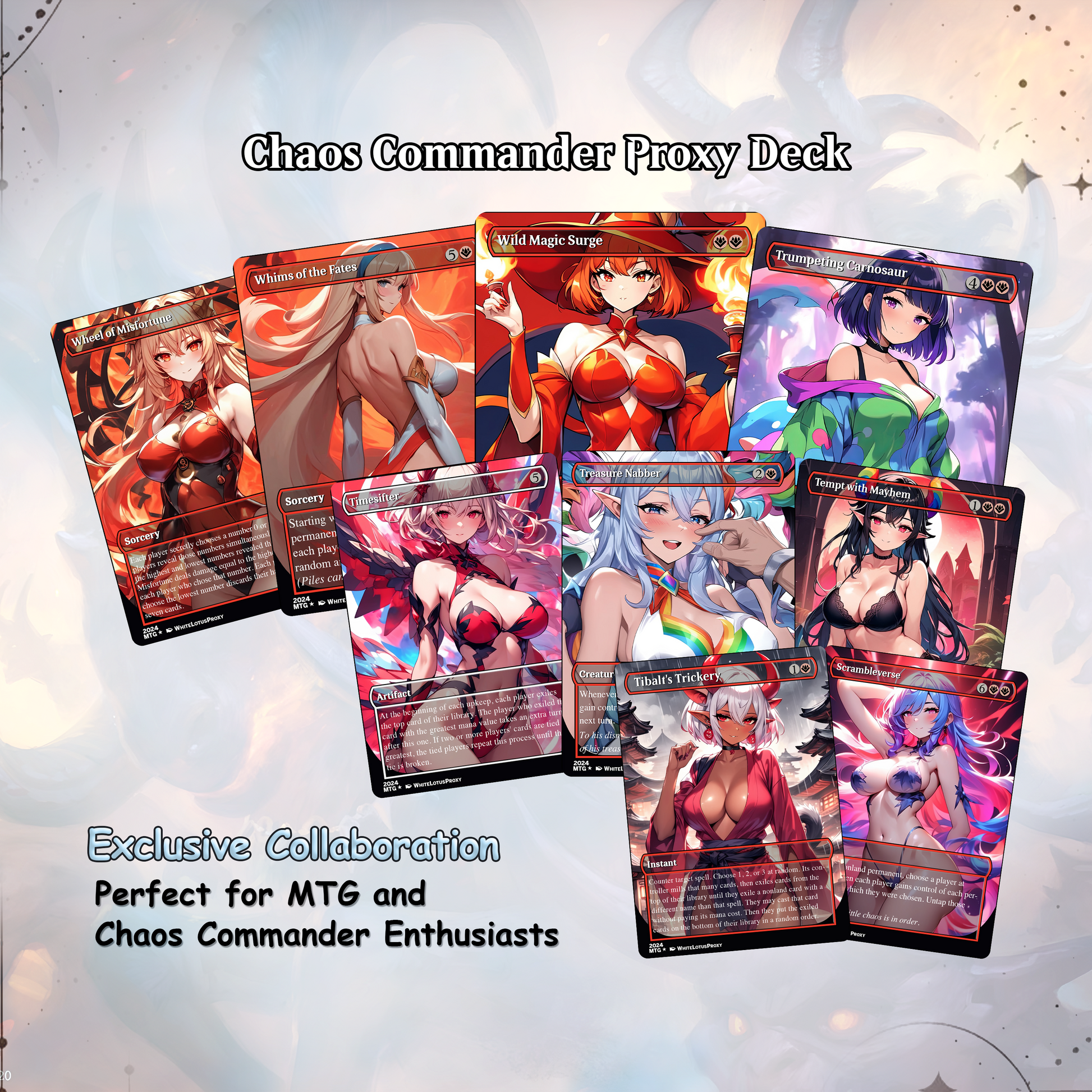 The Zurzoth Chaos Commander Deck – Anime Proxy Edition is a 100-card custom EDH deck built for unpredictable plays, cheeky interactions, and full-art anime visuals that command attention. With a Red-centric chaos strategy and a unique table-disrupting playstyle, this deck thrives on randomness and card advantage through mischievous design.