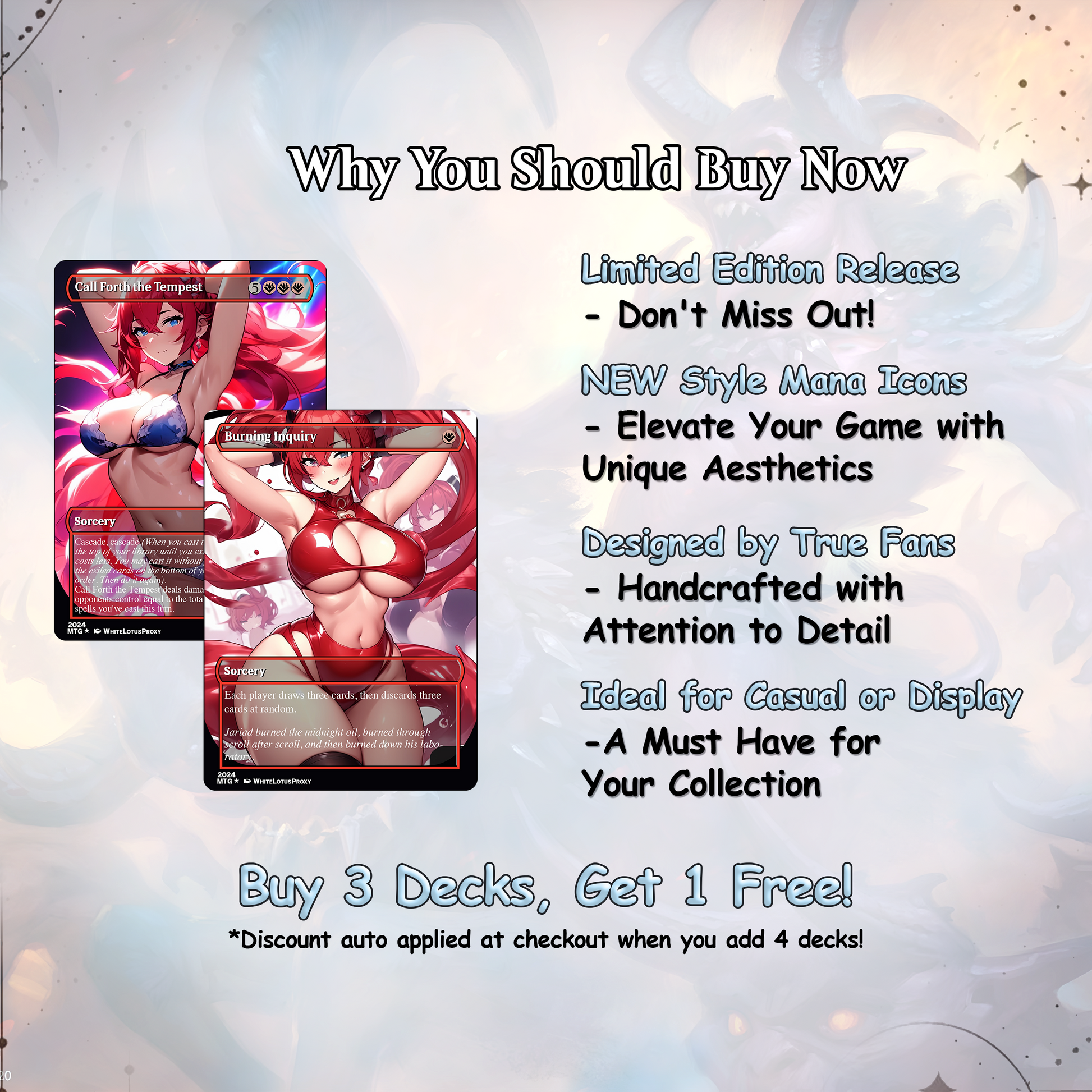 Our custom decks offer a truly unique experience, featuring fully frames, customized artwork, mana symbols, etc... designed to enhance the theme and style of each deck. Every card is meticulously crafted to provide a one-of-a-kind aesthetic while maintaining the quality you expect for seamless gameplay.