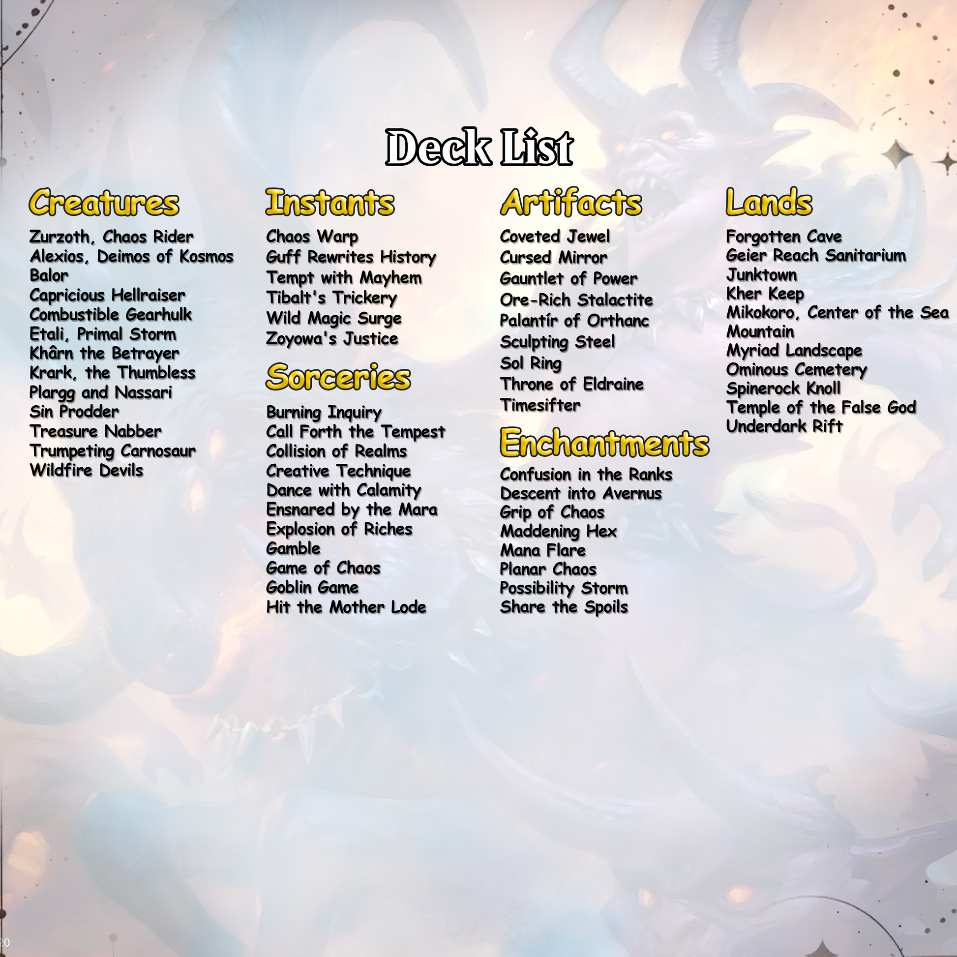Zurzoth creates a token-fueled storm of Red chaos. The deck capitalizes on randomized discard/draw mechanics, devil tokens, and group-wide triggers that shake up every turn. It rewards quick decision-making and plays best in Commander pods that enjoy unexpected board states and interactive combat.