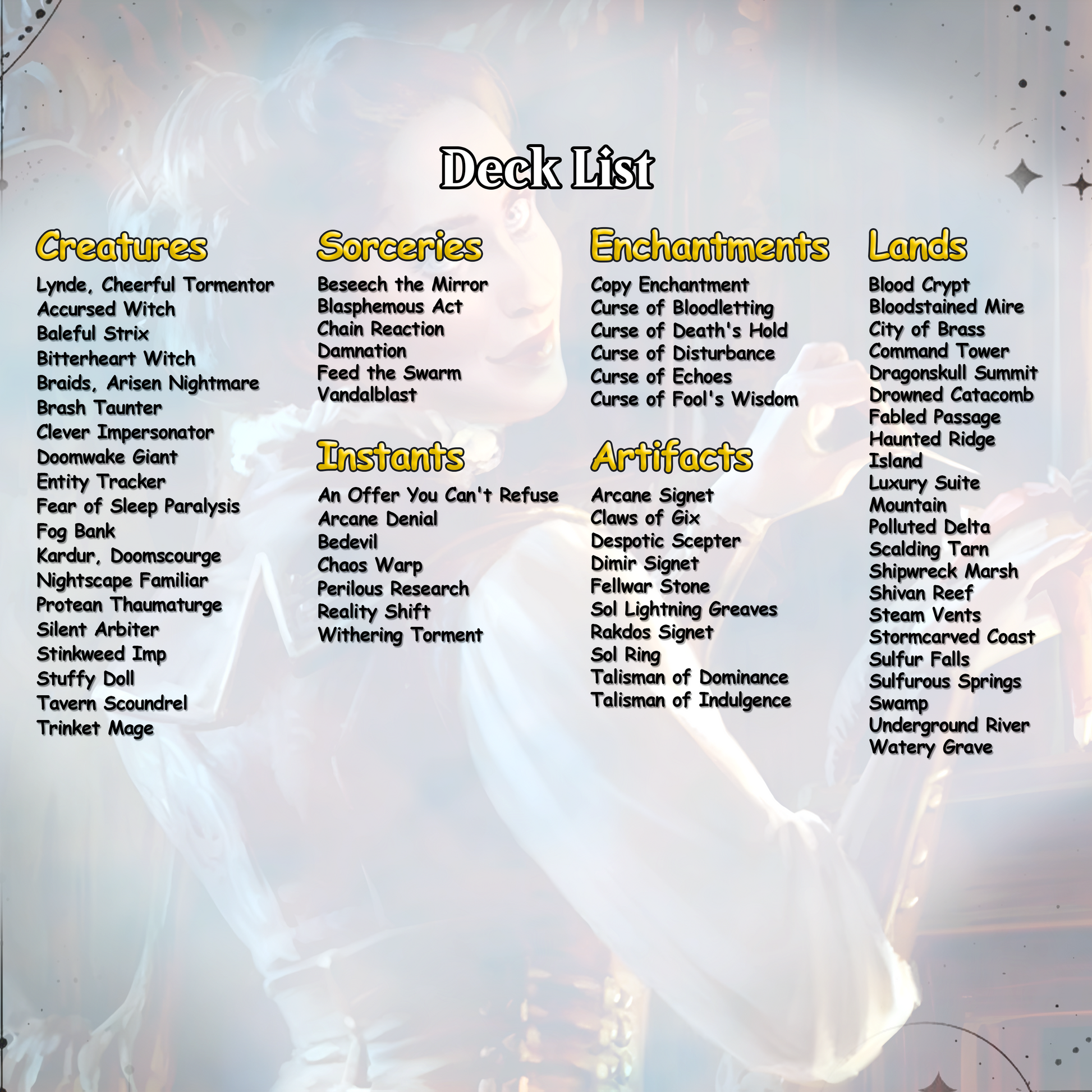 Lynde is all about applying persistent pressure through a variety of enchantments. You’ll spread curses across the table, forcing your opponents into awkward situations, draining value, and twisting the rules in your favor. With built-in protection and recursive value, this deck thrives in multiplayer games where every turn is unpredictable.
