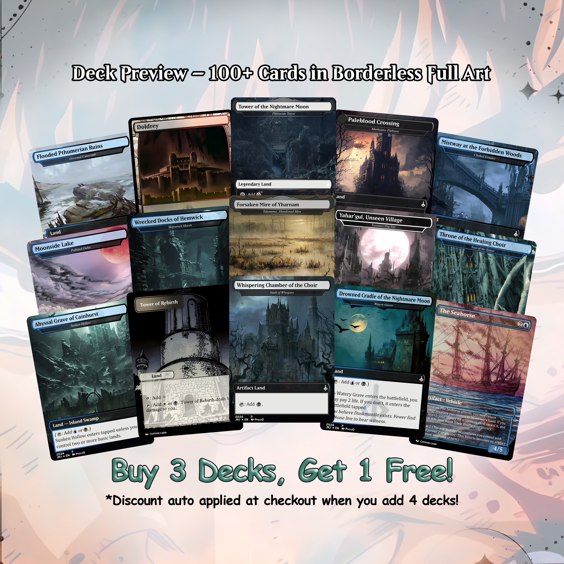 Our custom decks offer a truly unique experience, featuring fully frames, customized artwork, mana symbols, etc... designed to enhance the theme and style of each deck. Every card is meticulously crafted to provide a one-of-a-kind aesthetic while maintaining the quality you expect for seamless gameplay.