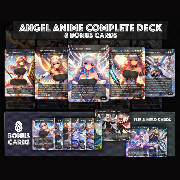 Summon a radiant host of angels with Giada, Font of Hope at the helm. This beautifully illustrated 108-card custom Commander deck is built to overwhelm the skies with iconic angels—each reimagined in breathtaking anime style. A tribute to lifegain, anthem effects, and dazzling synergy, this deck is a celestial powerhouse both in gamepla