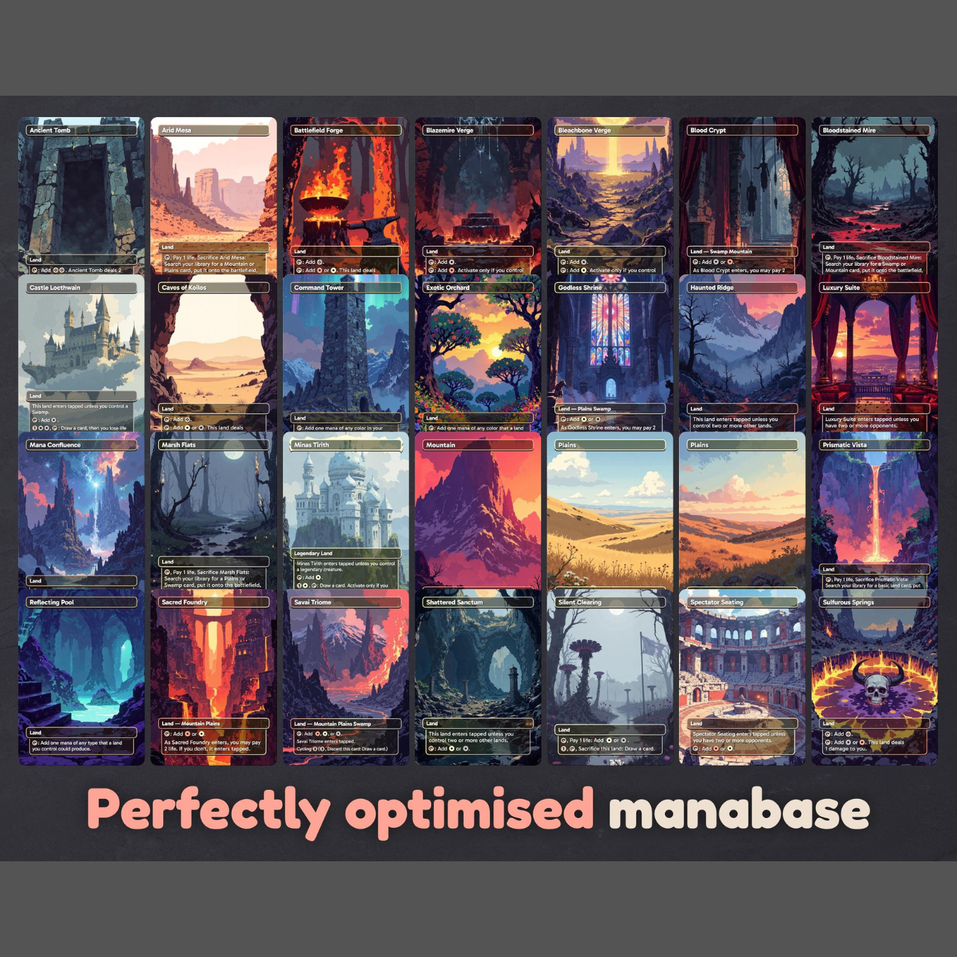 Our custom decks offer a truly unique experience, featuring fully frames, customized artwork, mana symbols, etc... designed to enhance the theme and style of each deck. Every card is meticulously crafted to provide a one-of-a-kind aesthetic while maintaining the quality you expect for seamless gameplay.