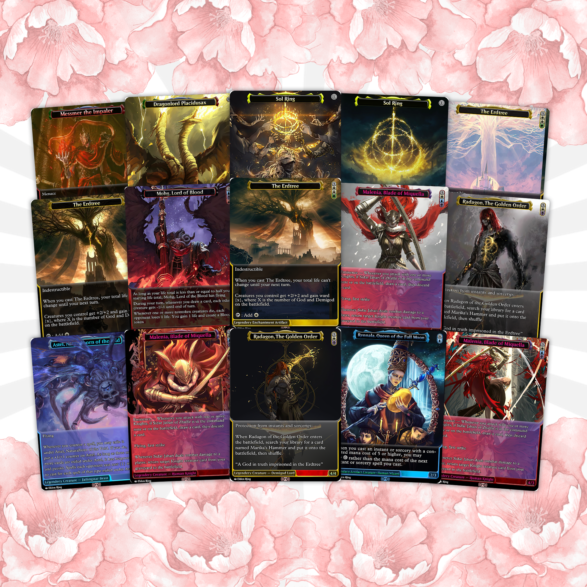 Step into the Lands Between with this E.l.d.e.n.Ri.n.g.-themed Commander deck featuring custom art, iconic characters, and immersive gameplay. Built on a 100+ card foundation, this deck combines Magic: The Gathering strategy with E.l.d.e.n.R.i.n.g.’s dark fantasy universe.