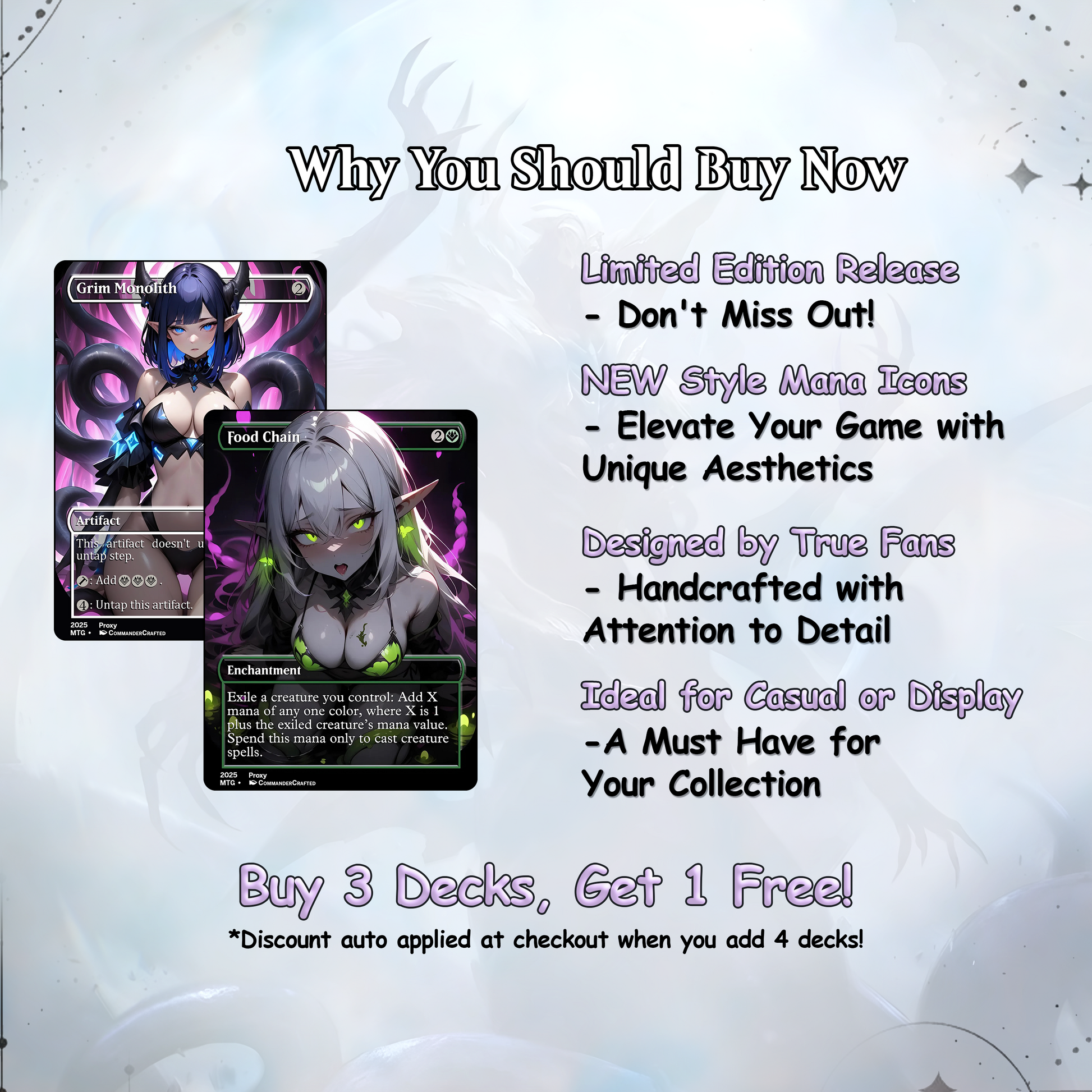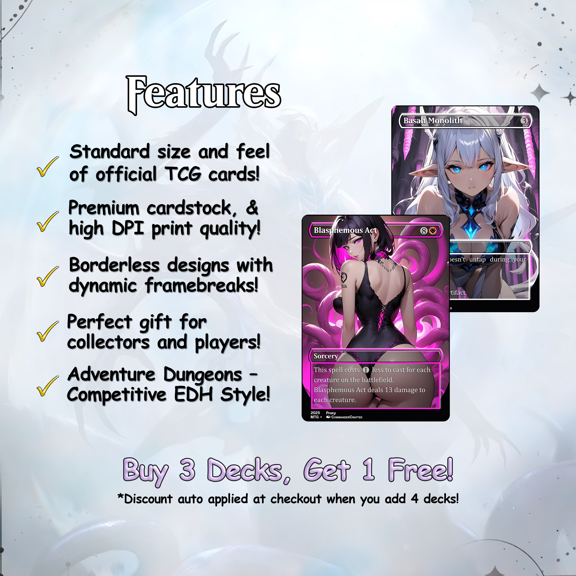 Our custom decks offer a truly unique experience, featuring fully frames, customized artwork, mana symbols, etc... designed to enhance the theme and style of each deck. Every card is meticulously crafted to provide a one-of-a-kind aesthetic while maintaining the quality you expect for seamless gameplay.
