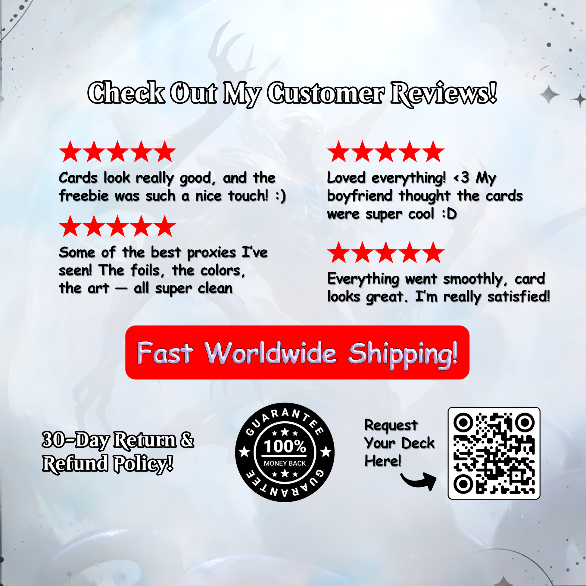 We encourage you to explore the photos and videos on our medias. If you have any questions or need further information, feel free to reach out to us at support@magicproxy.store —we’re here to help ensure you have the perfect deck for your collection or playstyle.