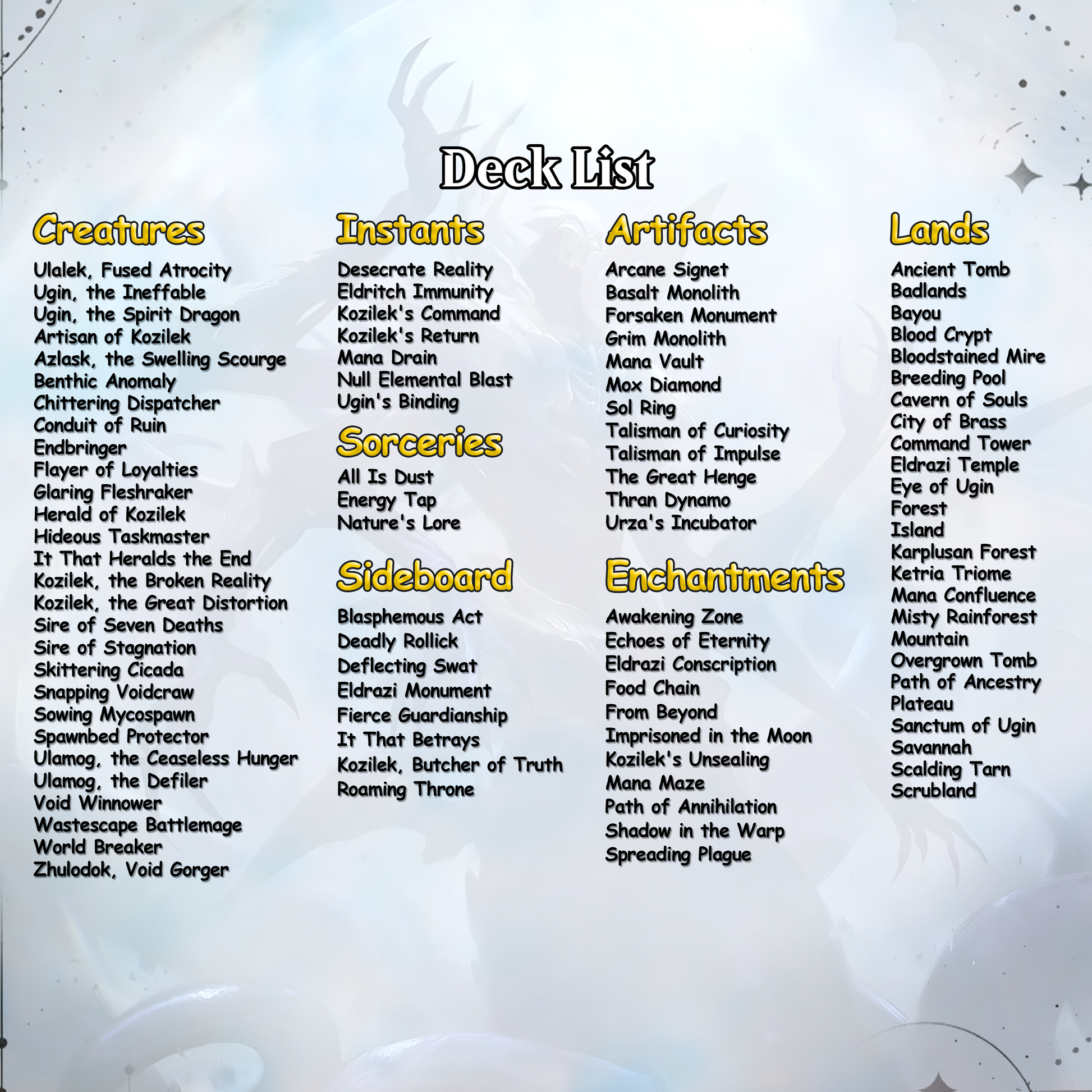 This deck ramps aggressively into a field of huge Eldrazi creatures backed by mana doublers and cheat effects. Ulalek unleashes waves of oversized threats that strip resources, exile permanents, and dominate combat phases.