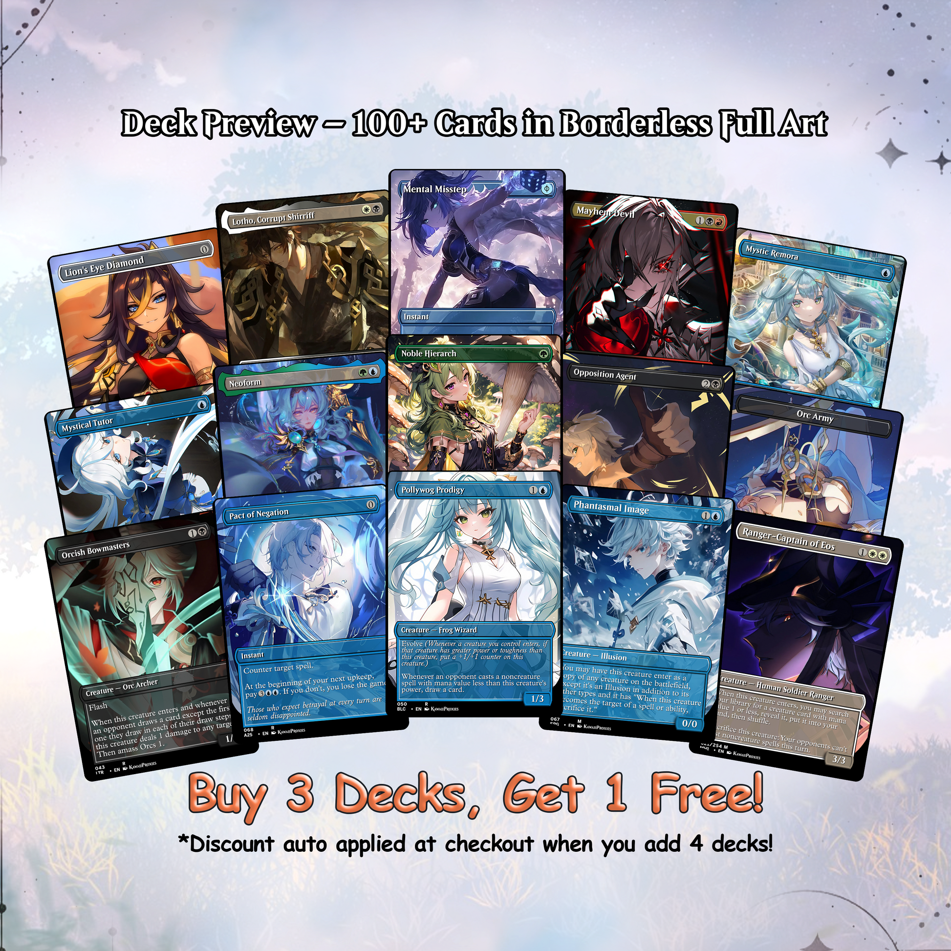 Our custom decks offer a truly unique experience, featuring fully frames, customized artwork, mana symbols, etc... designed to enhance the theme and style of each deck. Every card is meticulously crafted to provide a one-of-a-kind aesthetic while maintaining the quality you expect for seamless gameplay.