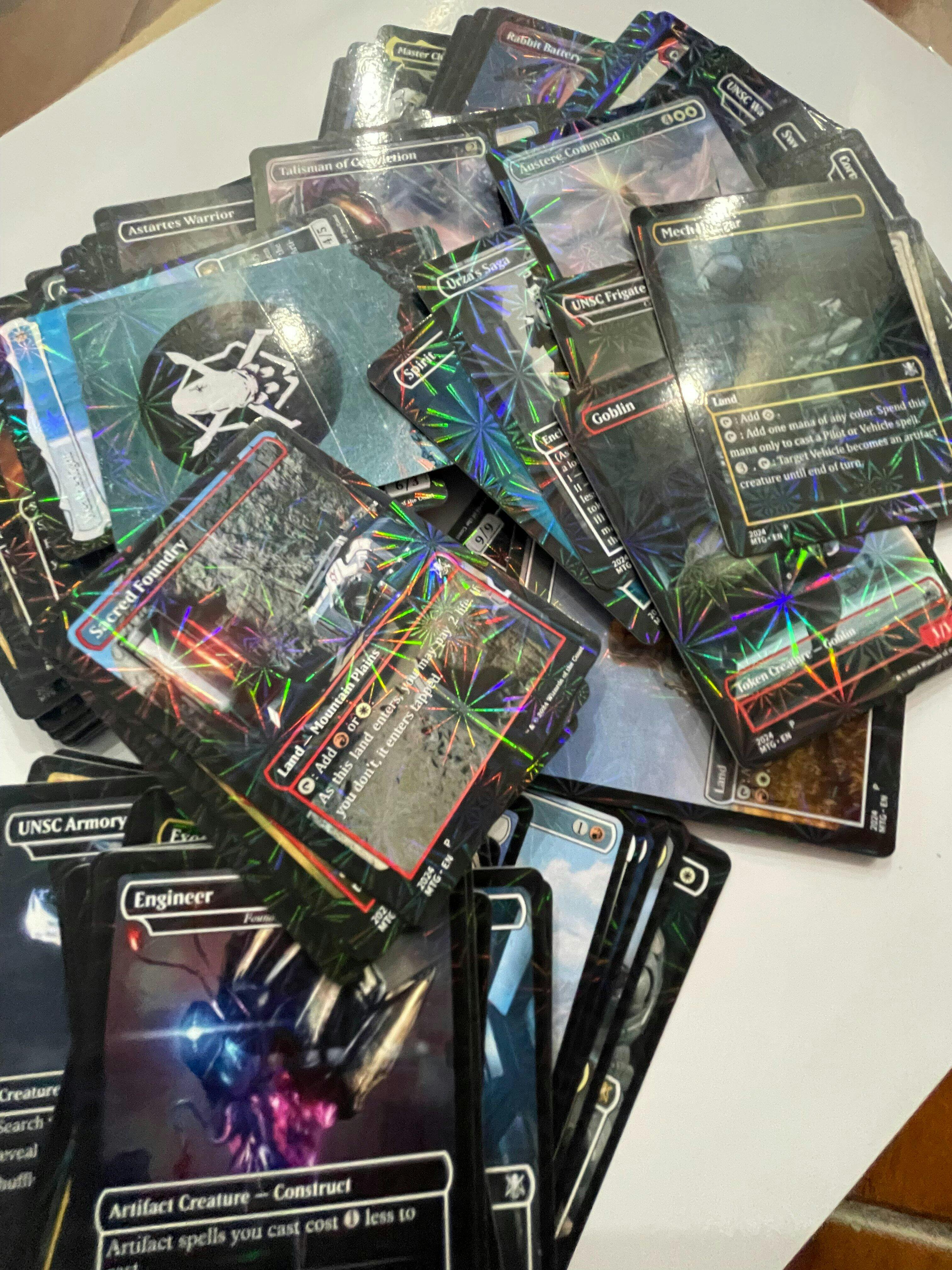 Great cards. Deck came with 103 card with differnt names so ill have to figure out what 3 to remove. But came with 4 differnt arts for the commander and a token for each kind needed