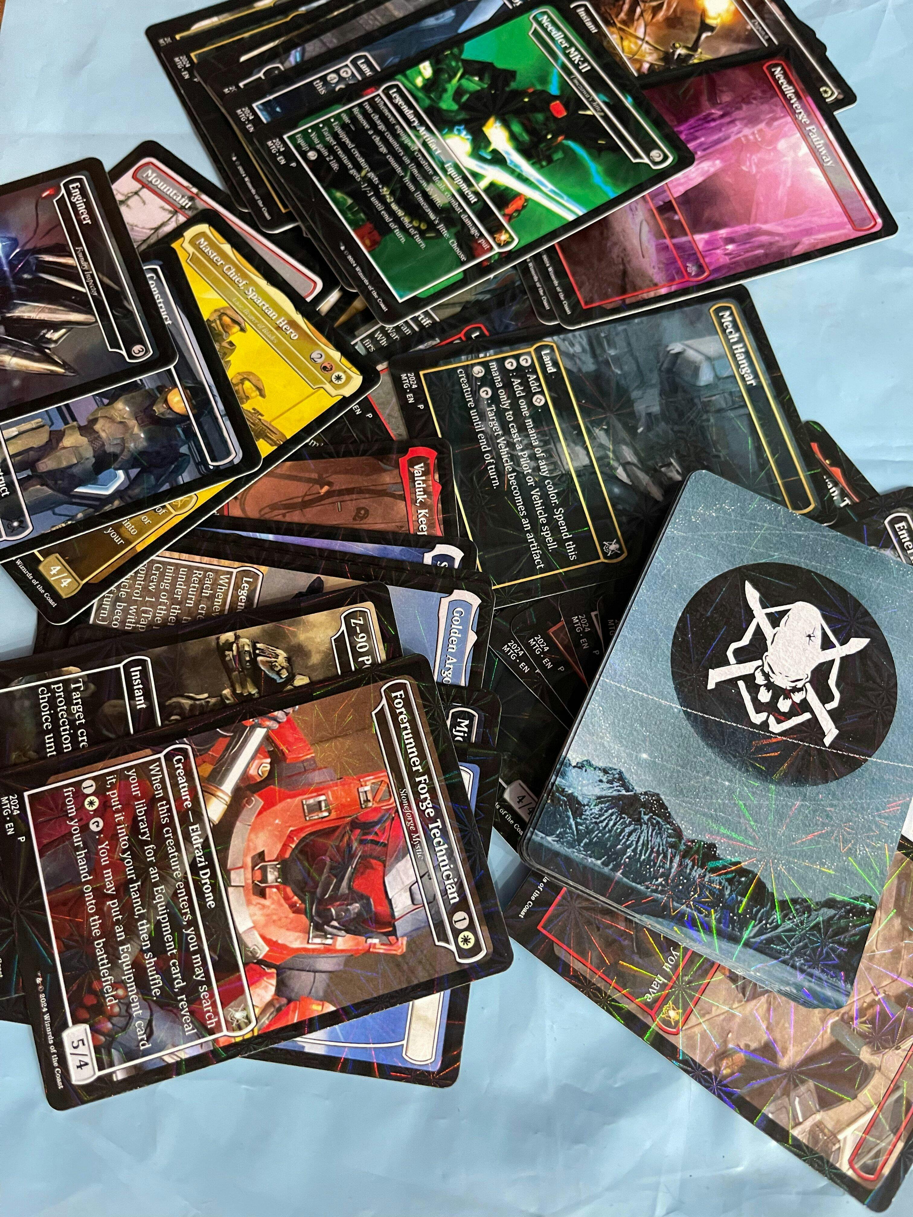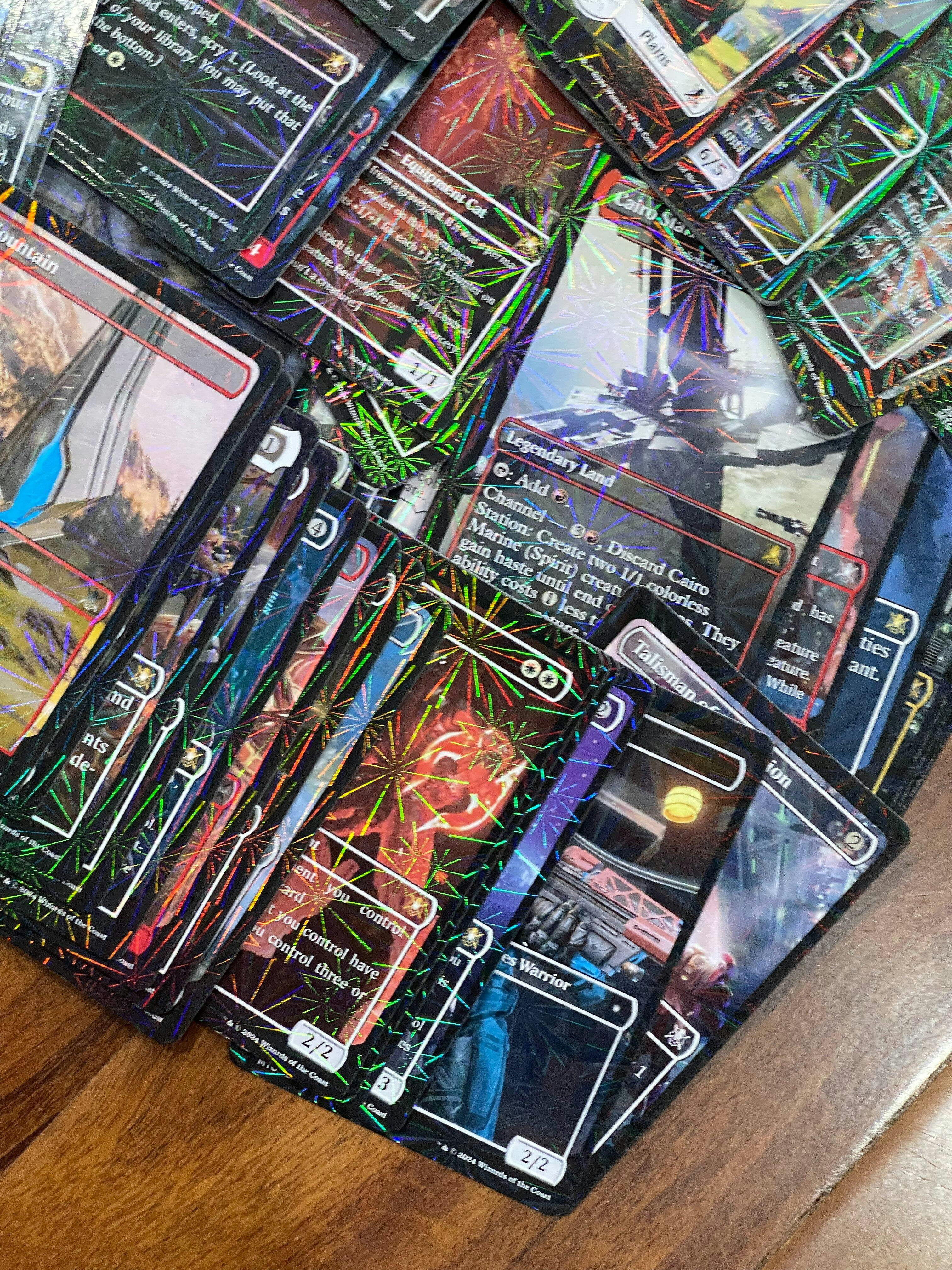 Our custom decks offer a truly unique experience, featuring fully frames, customized artwork, mana symbols, etc... designed to enhance the theme and style of each deck. Every card is meticulously crafted to provide a one-of-a-kind aesthetic while maintaining the quality you expect for seamless gameplay.