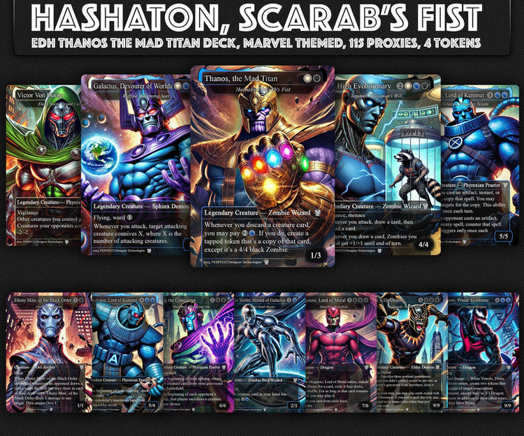 Step into a M.a.r.v.e.l. x MTG fusion with H.a.s.h.a.t.o.n., the S.c.a.r.a.b.'s Fist, a 115-card Commander deck packed with iconic characters like T.h.a.n.o.s. and High Evolutionary. Engineered for cEDH-level gameplay and fan appeal, this powerful list brings heroic synergy and villainous combos to your next Commander night.