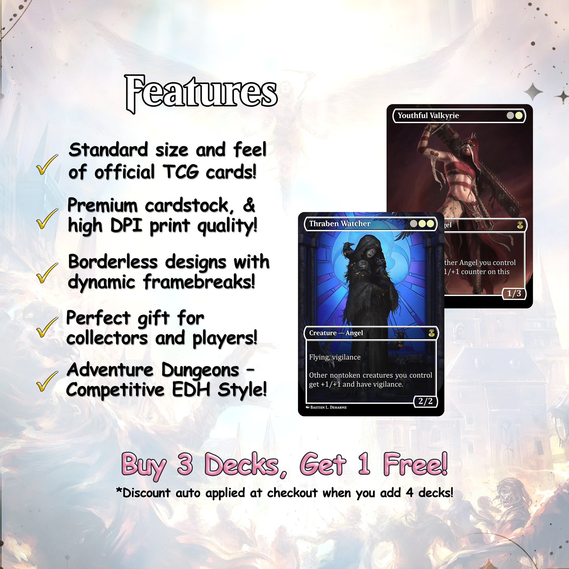 Our custom decks offer a truly unique experience, featuring fully frames, customized artwork, mana symbols, etc... designed to enhance the theme and style of each deck. Every card is meticulously crafted to provide a one-of-a-kind aesthetic while maintaining the quality you expect for seamless gameplay.