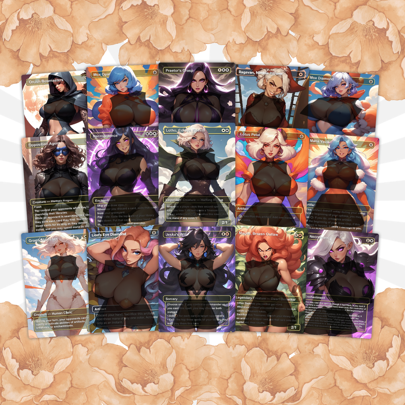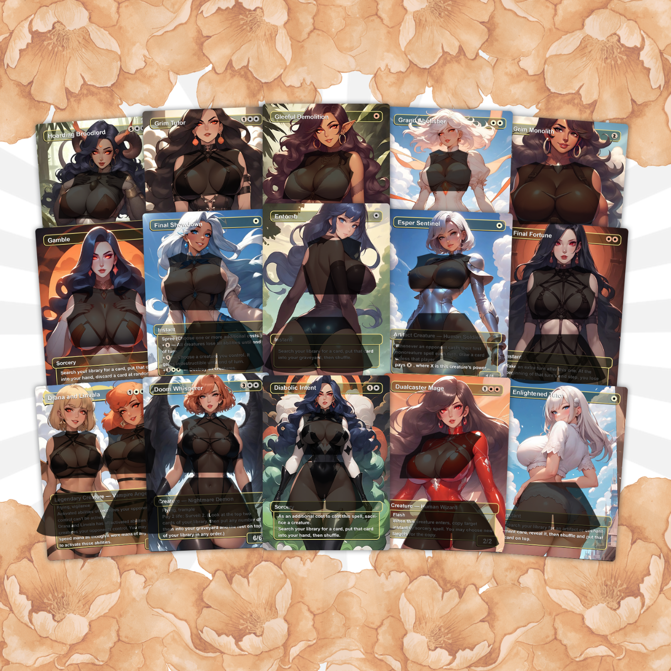 Our custom decks offer a truly unique experience, featuring fully frames, customized artwork, mana symbols, etc... designed to enhance the theme and style of each deck. Every card is meticulously crafted to provide a one-of-a-kind aesthetic while maintaining the quality you expect for seamless gameplay.