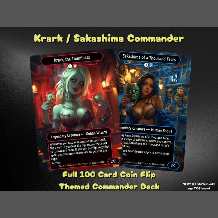 This custom 100-card Krark Coin Flip Commander Deck is designed for chaotic fun, clever combos, and stunning anime-themed flair. Whether you're chasing infinite loops or just love the thrill of chance, this deck captures the essence of randomness and rewards in every spell you cast.