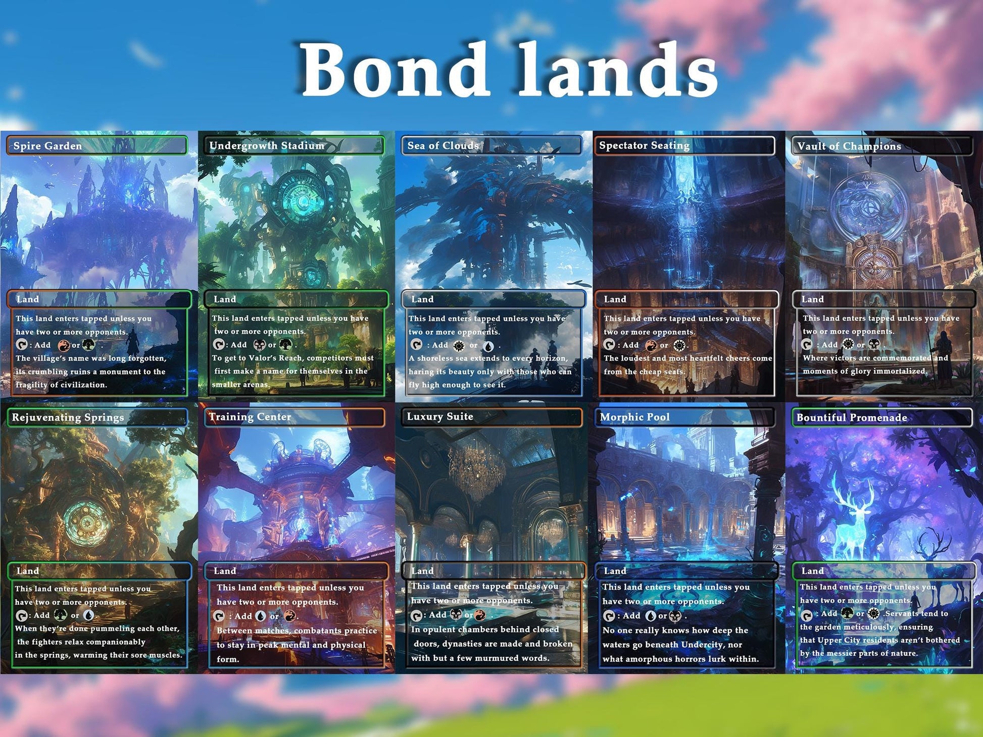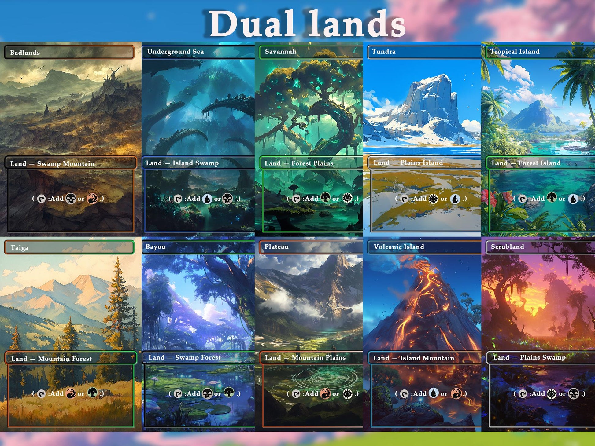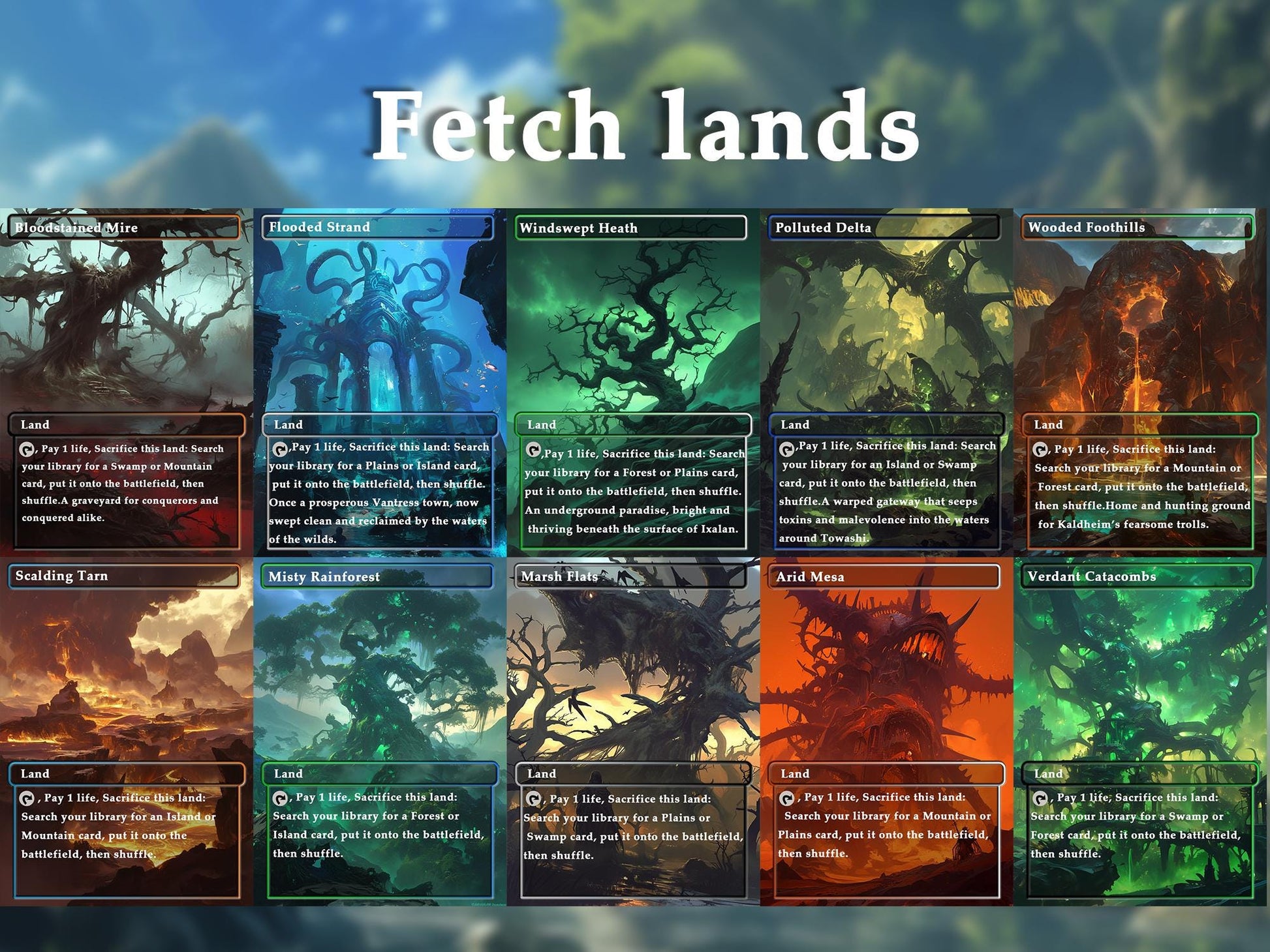 edh, mtg proxy lands, anime mtg lands, commander mana base, mtg basic lands, mtg custom cards, dual lands, fetch lands, mtg deck accessory, full-art lands, mtg watercolor land set, borderless lands, mtg proxies