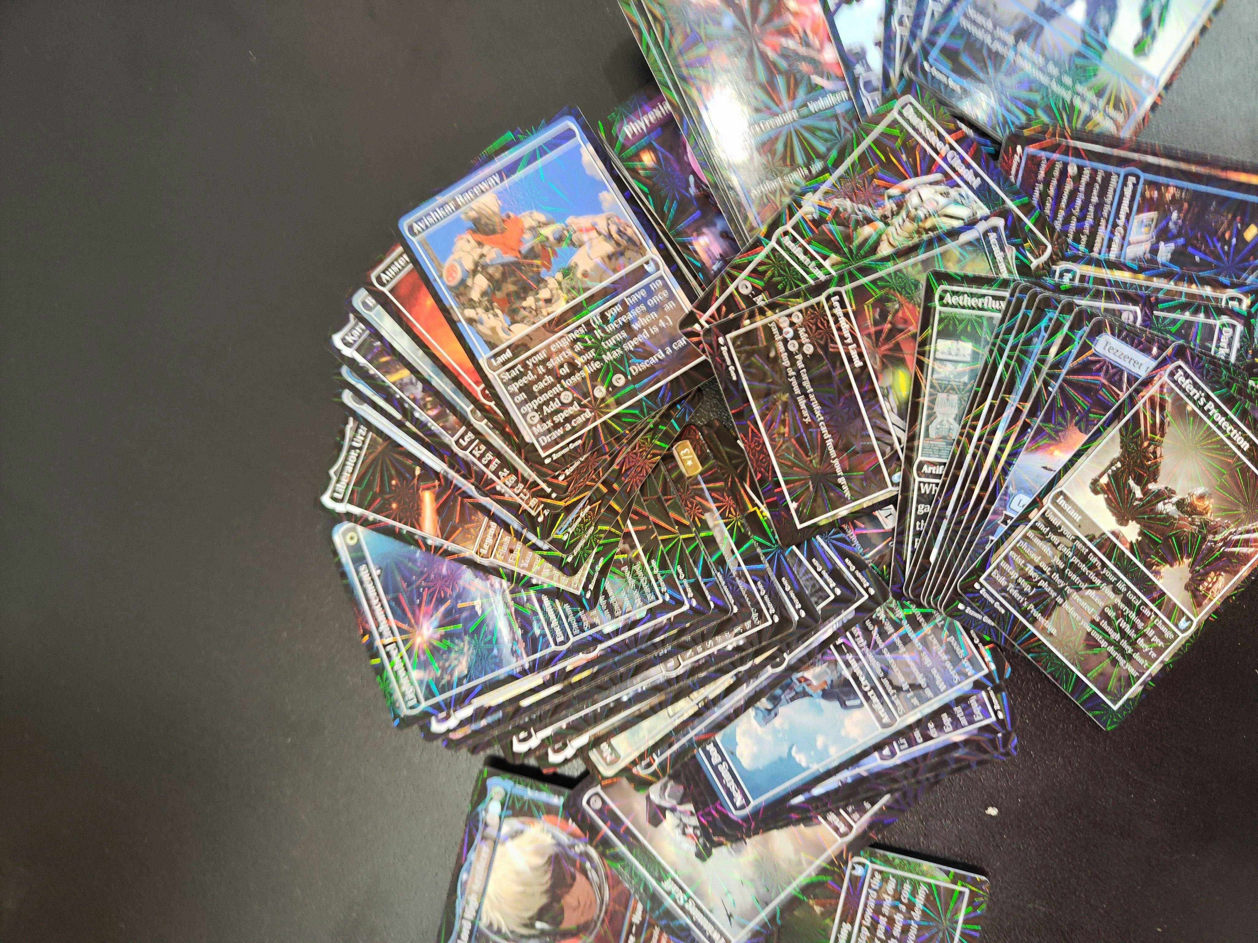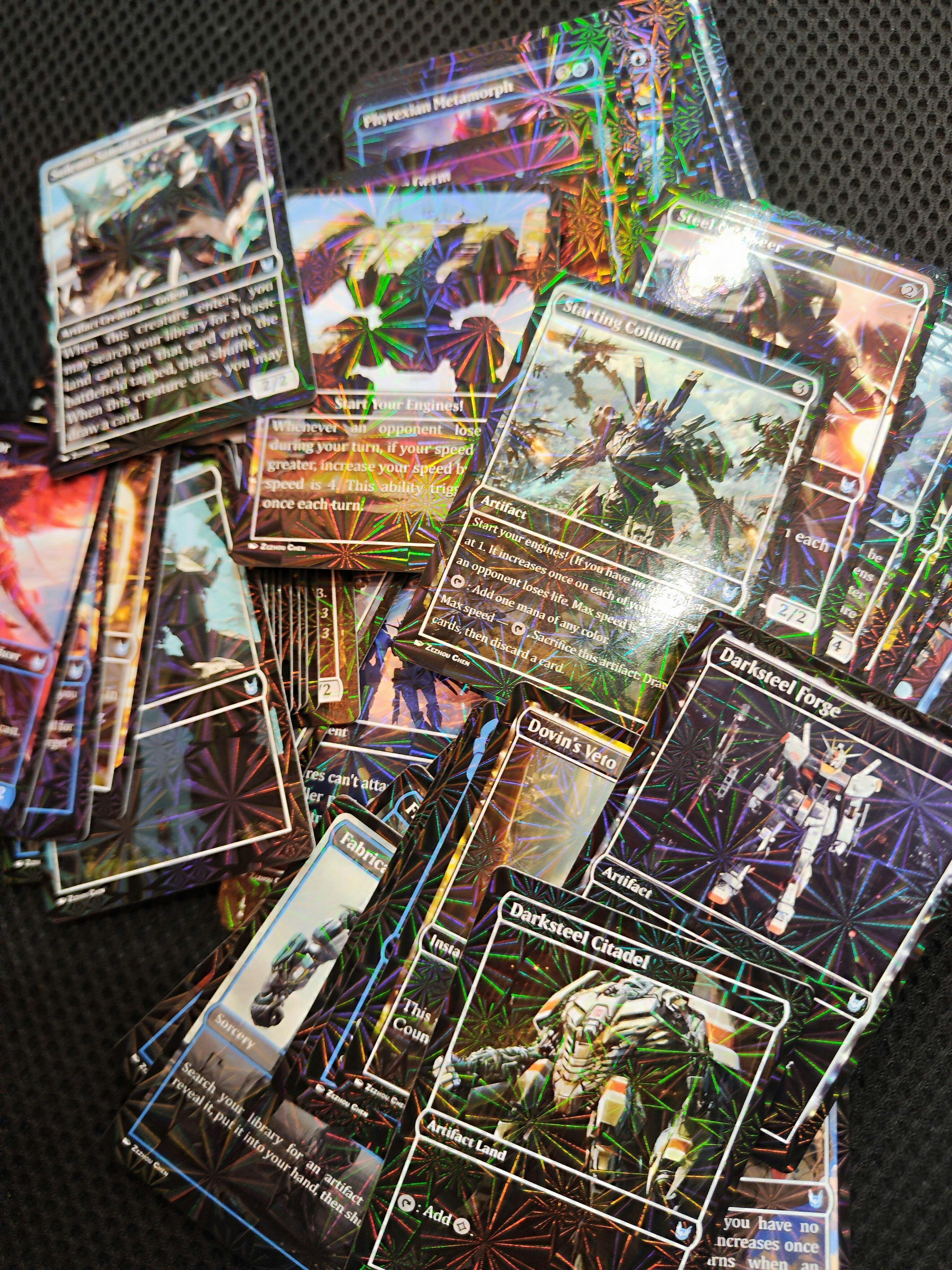 Our custom decks offer a truly unique experience, featuring fully frames, customized artwork, mana symbols, etc... designed to enhance the theme and style of each deck. Every card is meticulously crafted to provide a one-of-a-kind aesthetic while maintaining the quality you expect for seamless gameplay.
