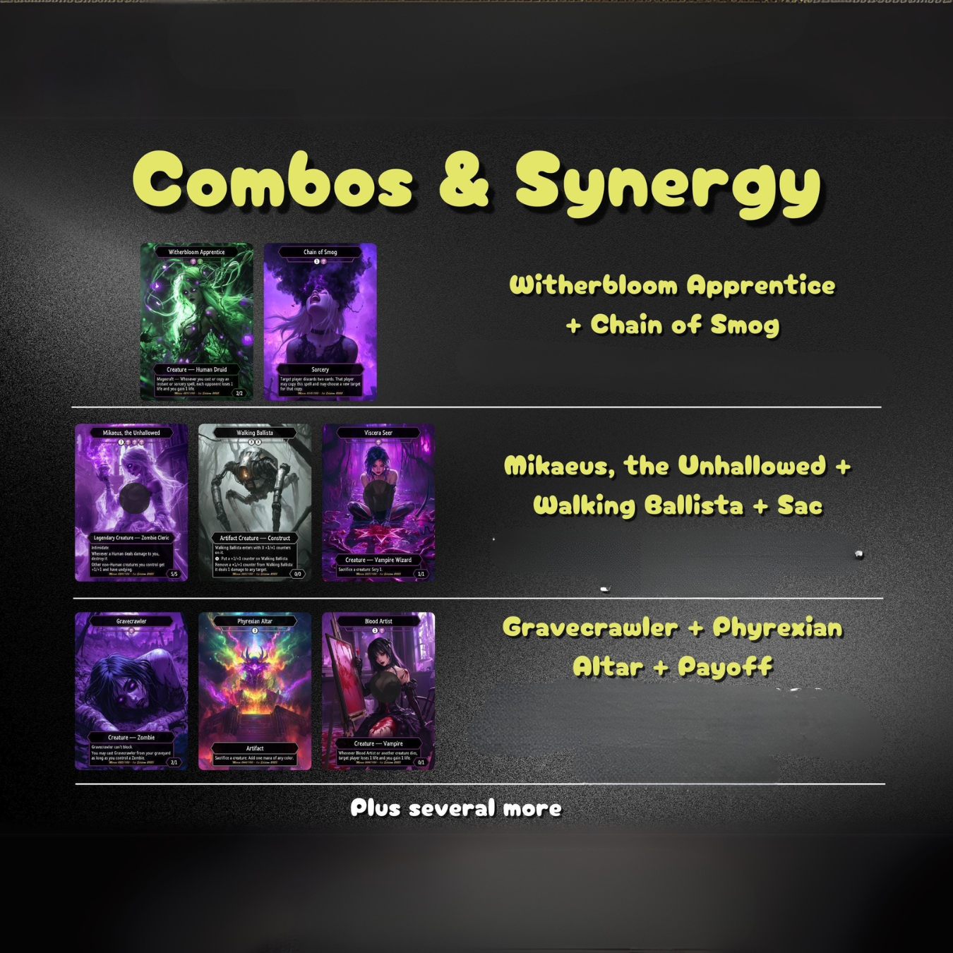 This deck revolves around reanimation loops, sacrifice triggers, and recursive value. Meren grows stronger as your creatures die, allowing you to return key pieces from the graveyard turn after turn. With tokens, death triggers, and targeted removal, you'll grind out advantage until you overwhelm the board.