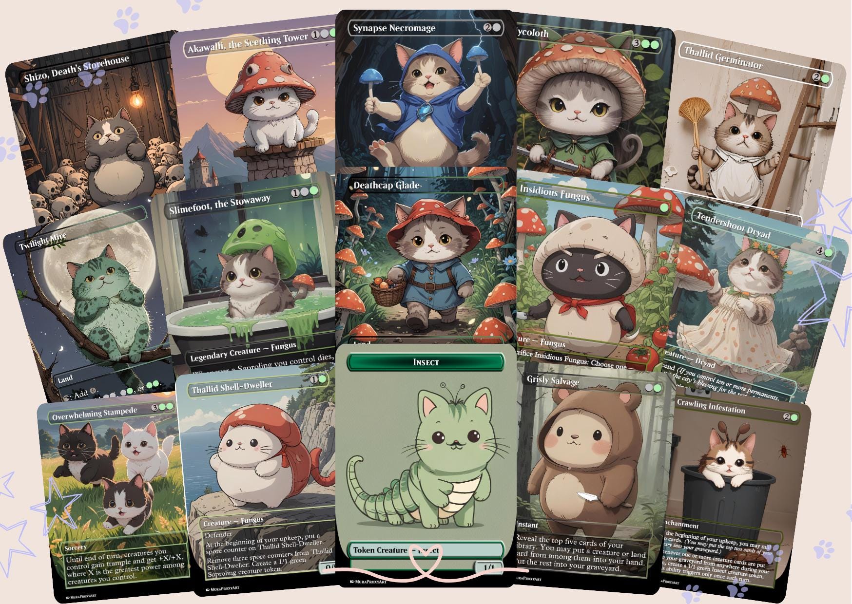 Spore up and swarm down! This custom Mycotyrant deck floods the field with adorable fungus and saproling tokens using a self-mill strategy — all wrapped in irresistibly cute art.