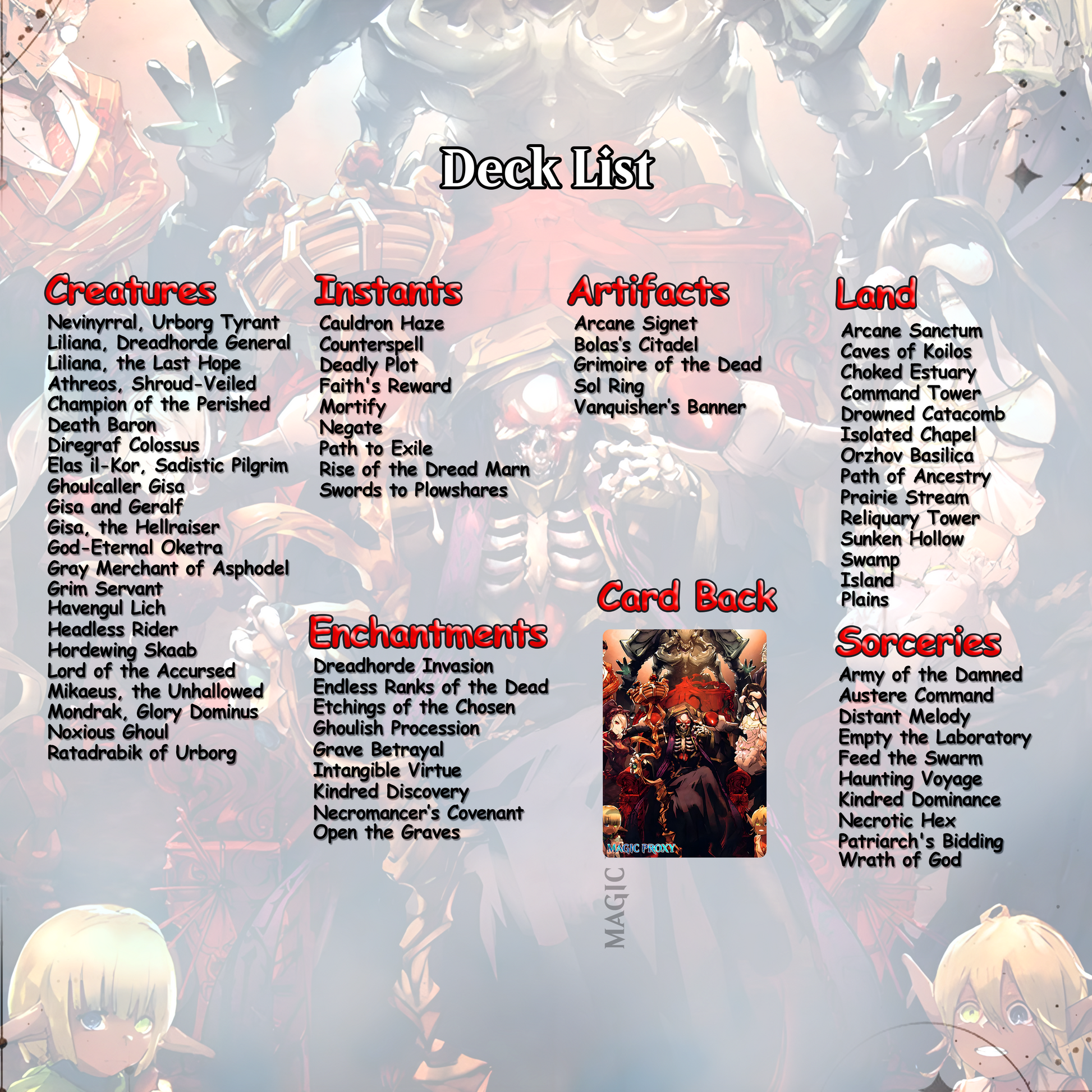 💀⚔️ Rise, O fallen legions of the dead! Step into a world where the grave is never silent — where Nevinyrral, Urborg Tyrant reigns supreme as the Overlord of decay and rebirth. This anime-inspired Commander deck transforms the table into a gothic battlefield, where every fallen creature feeds the endless army of the damned.