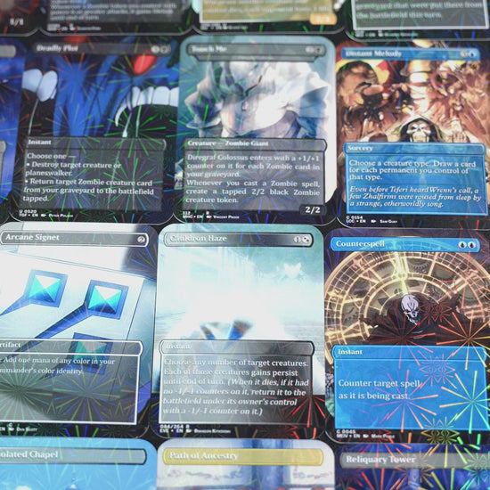 Our custom decks offer a truly unique experience, featuring fully frames, customized artwork, mana symbols, etc... designed to enhance the theme and style of each deck. Every card is meticulously crafted to provide a one-of-a-kind aesthetic while maintaining the quality you expect for seamless gameplay.