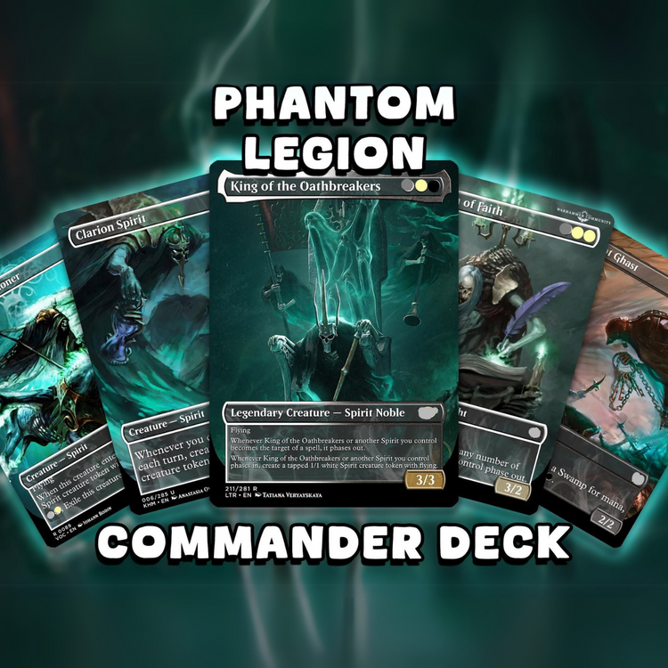 Lead a spectral army through the veil of reality with the Phantom Legion, a Spirit Tribal Commander Deck built for haunting synergy and flicker-based gameplay. Featuring the King of the Oathbreakers as your commander, this deck dances between realms—phasing in and out to create value, disrupt enemies, and summon spectral forces in waves.