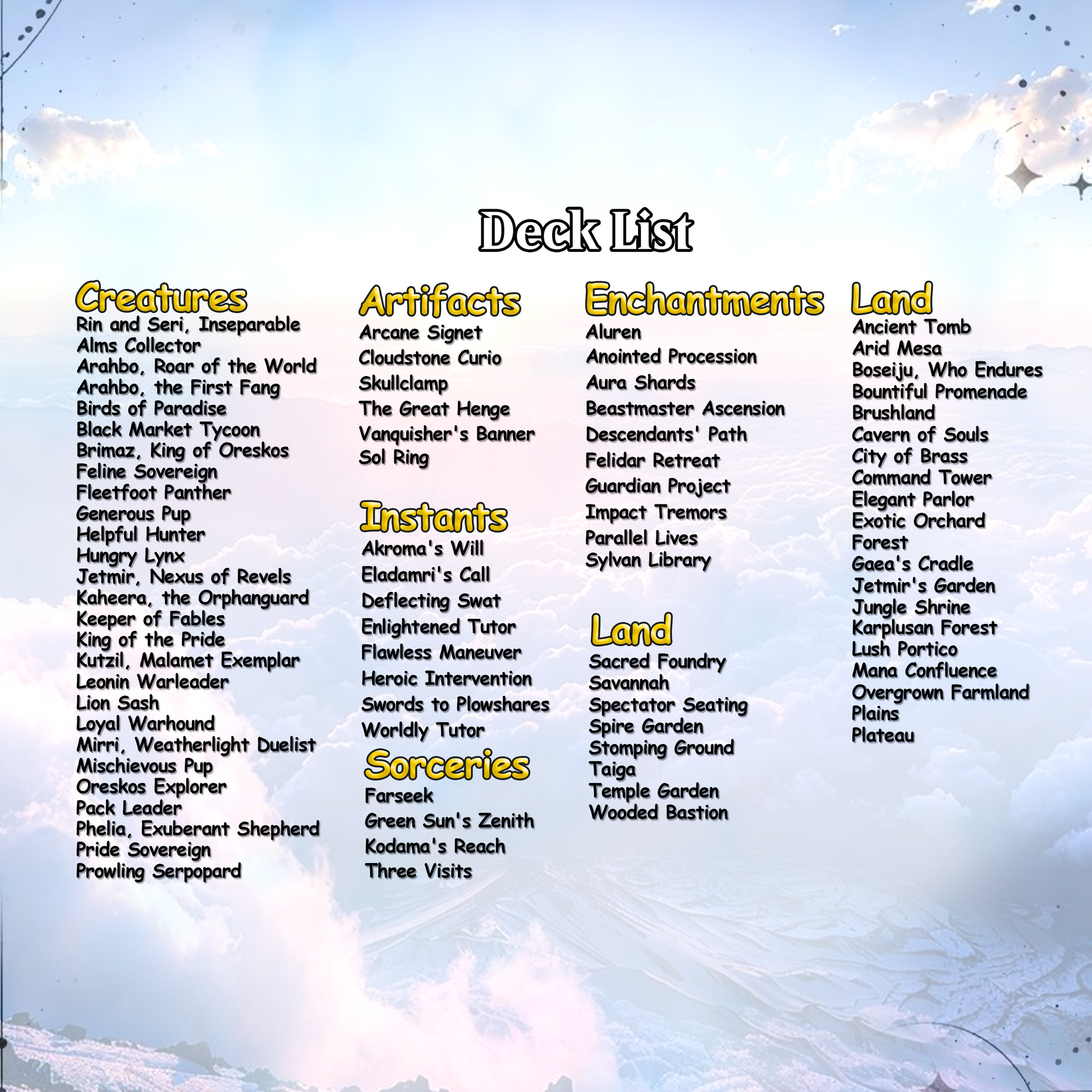 This is a fun, lighthearted deck for pet lovers and casual players. Use Rin and Seri to generate Cat and Dog tokens, then synergize with blink effects, ETB combos, and token payoffs to fill the board and bring the fluff-powered win.