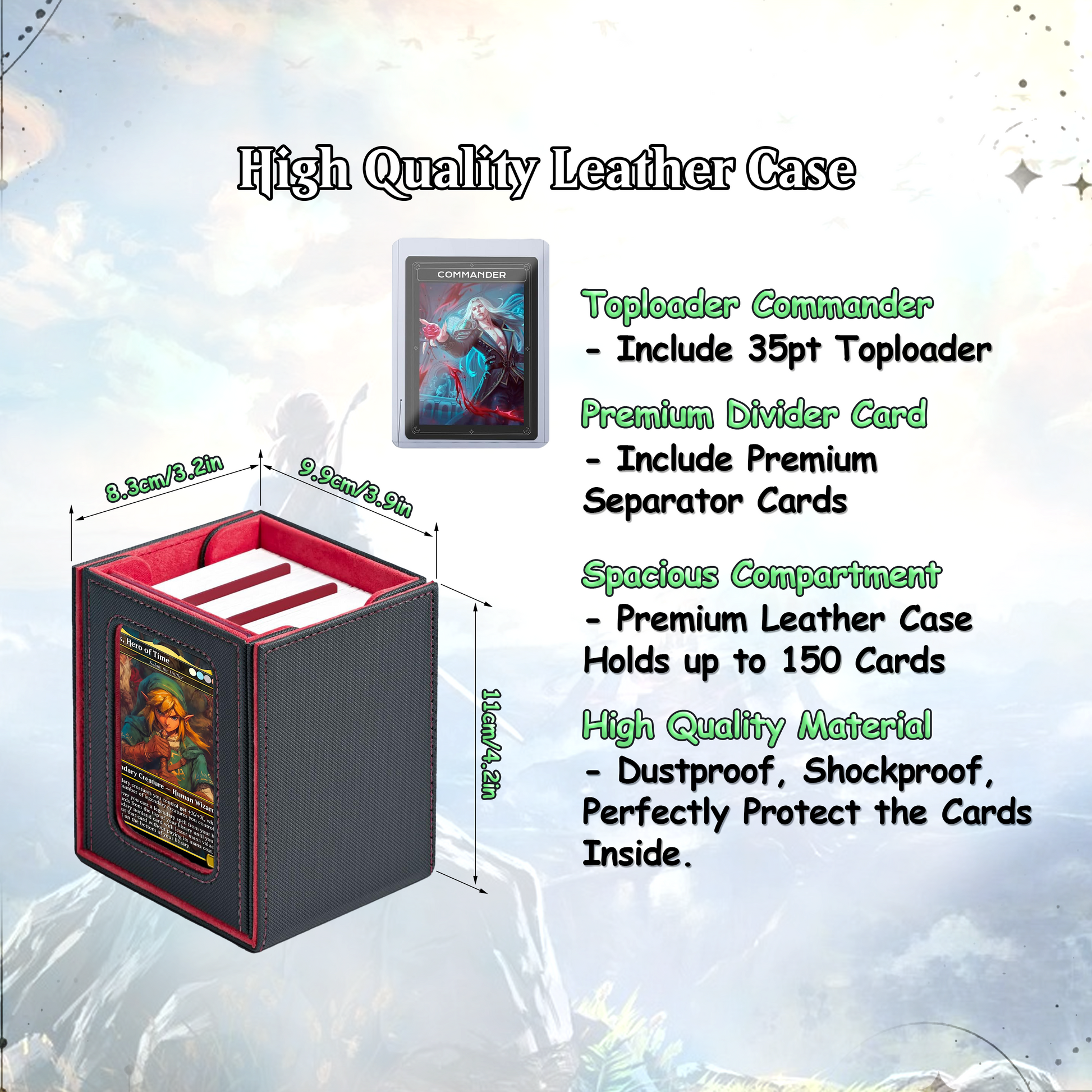 Our custom Commander decks are made in the standard card size and has rounded corners, ensuring compatibility with your collection and accessories. Measuring 63mm x 88mm (2.5” x 3.5”), these cards are designed to fit seamlessly into sleeves, deck boxes, and shuffling routines.🌟