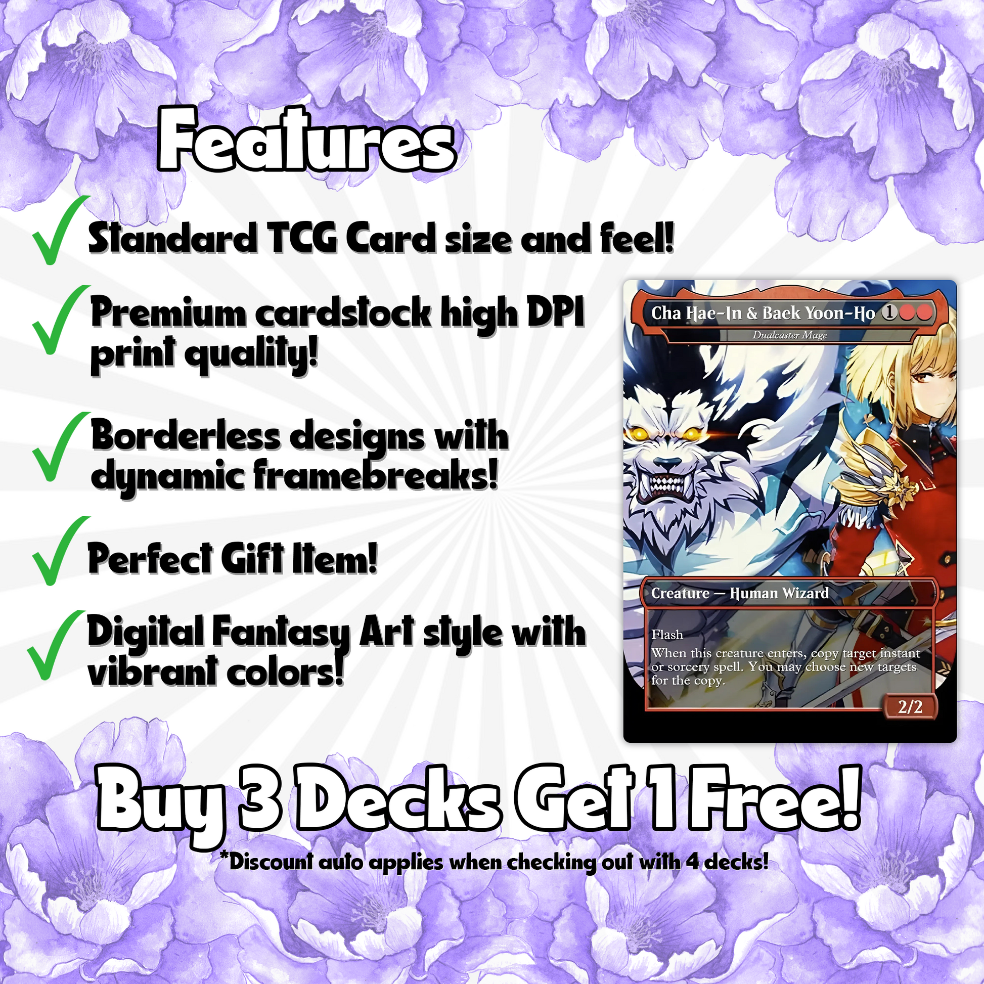 Our custom Commander decks are made in the standard card size and has rounded corners, ensuring compatibility with your collection and accessories. Measuring 63mm x 88mm (2.5” x 3.5”), these cards are designed to fit seamlessly into sleeves, deck boxes, and shuffling routines.🌟