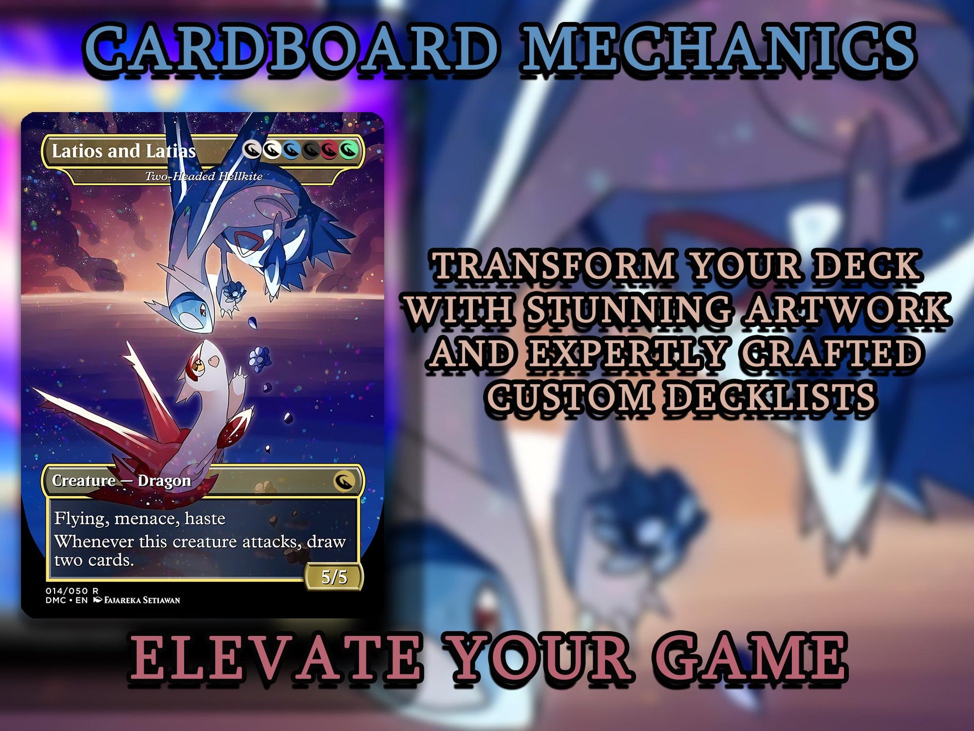 Our custom decks offer a truly unique experience, featuring fully frames, customized artwork, mana symbols, etc... designed to enhance the theme and style of each deck. Every card is meticulously crafted to provide a one-of-a-kind aesthetic while maintaining the quality you expect for seamless gameplay.