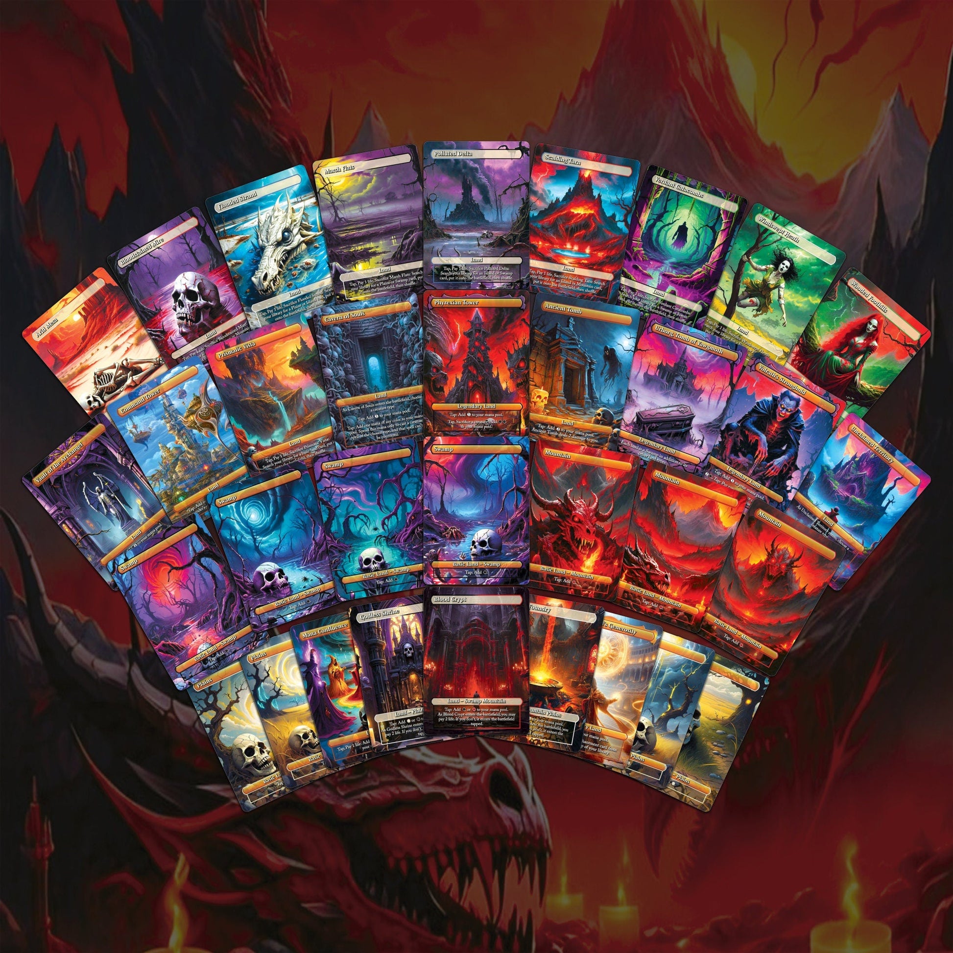 Our custom decks offer a truly unique experience, featuring fully frames, customized artwork, mana symbols, etc... designed to enhance the theme and style of each deck. Every card is meticulously crafted to provide a one-of-a-kind aesthetic while maintaining the quality you expect for seamless gameplay.