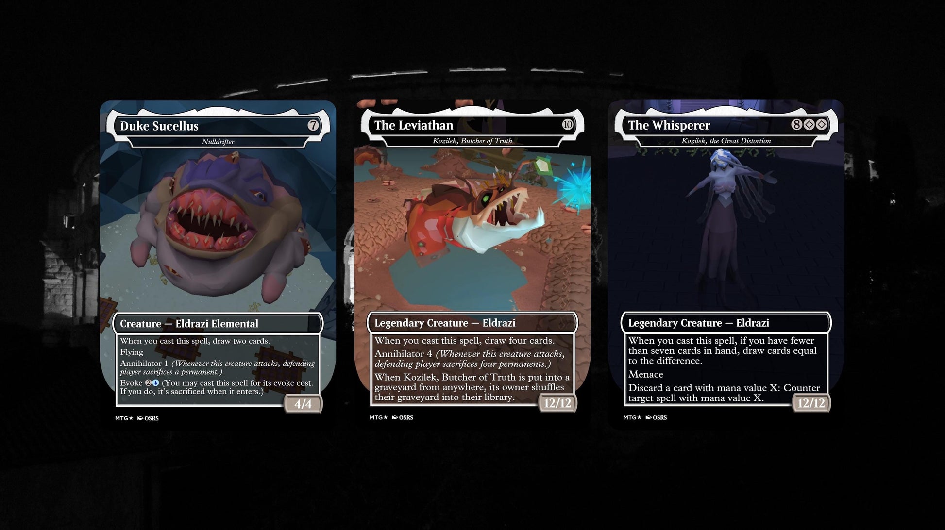 Ramp up into massive Eldrazi horrors with powerful mana rocks and lands. Leverage discard, annihilator triggers, and board wipes to dominate the game. Summon iconic OSRS bosses like Jad, Zuk, and the Godwars generals as your creatures while controlling the board with classic Eldrazi finishers. Whether you prefer Nex’s relentless aggression or Vardorvis’s cunning tactics, every game feels like a nostalgic raid.