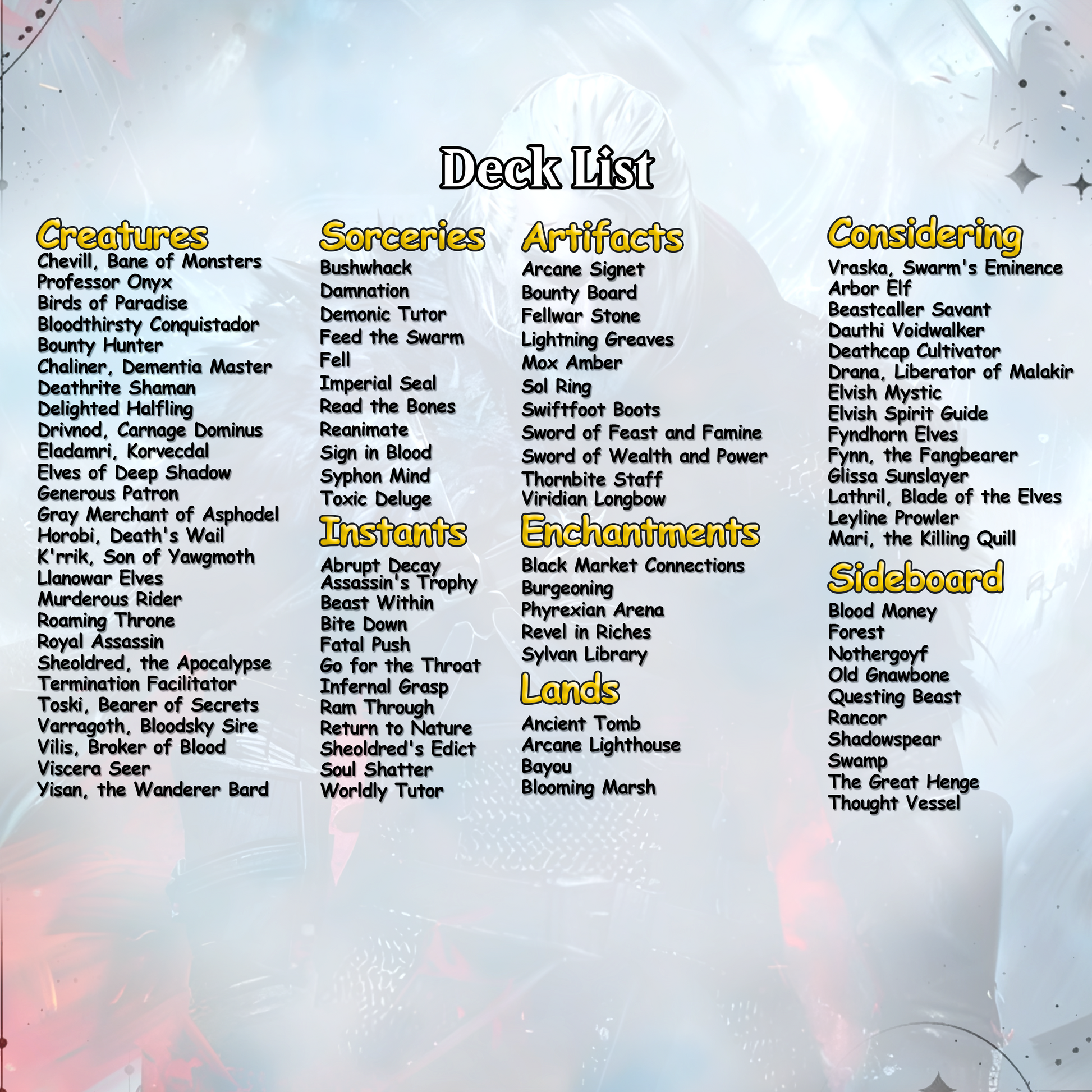🕯️ The late game unfolds like a contract come due — Gray Merchant, Vilis, Broker of Blood, and Sheoldred close the hunt with massive drain and recursion loops. Revel in Riches and Reanimate ensure even the dead work for you, as Bolas’s Citadel turns your deck into a weapon of precision.
